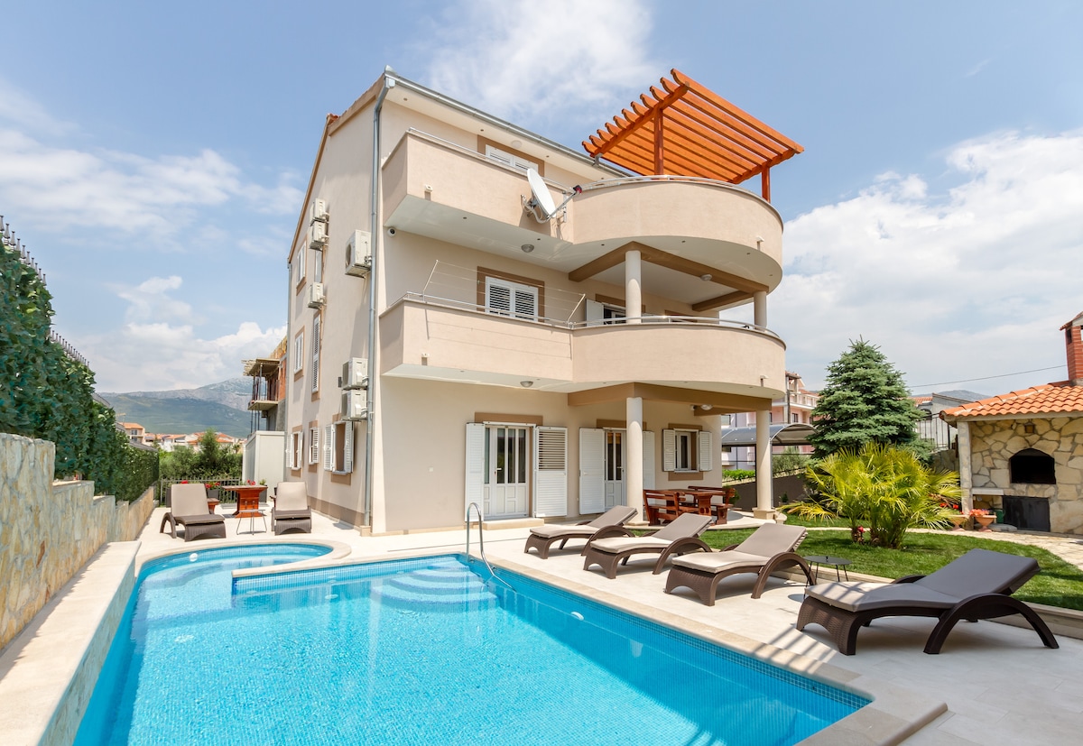"GREEN DREAM" offers accommodation for 12 people. Two luxurious, modern and fully equipped apartments with 5 bedrooms, offer access to the outdoor terrace with its own vintage kitchen, a toilet, a small gym and space for fun with billiard. The neighborhood is very quite with no car noise. From the terrace there is access to pool and beautiful big garden with a picturesque gazebo covered with fragrant jasmine. Property is just 4 km away from the center of Split and Diocletian's Palace!