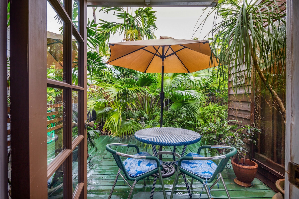 *Recent Update (2025): We’ve made a wonderful upgrade to the studio bathroom — it’s now fully enclosed with walls extending to the ceiling and a new exhaust fan for ventilation. Situated in the heart of the Cuban district, just steps from arguably the best café con leche in Key West, this bright and breezy studio apartment is minutes from everything on the island. No car needed — bikes and beach chairs are provided free of charge so you can explore at your own pace.