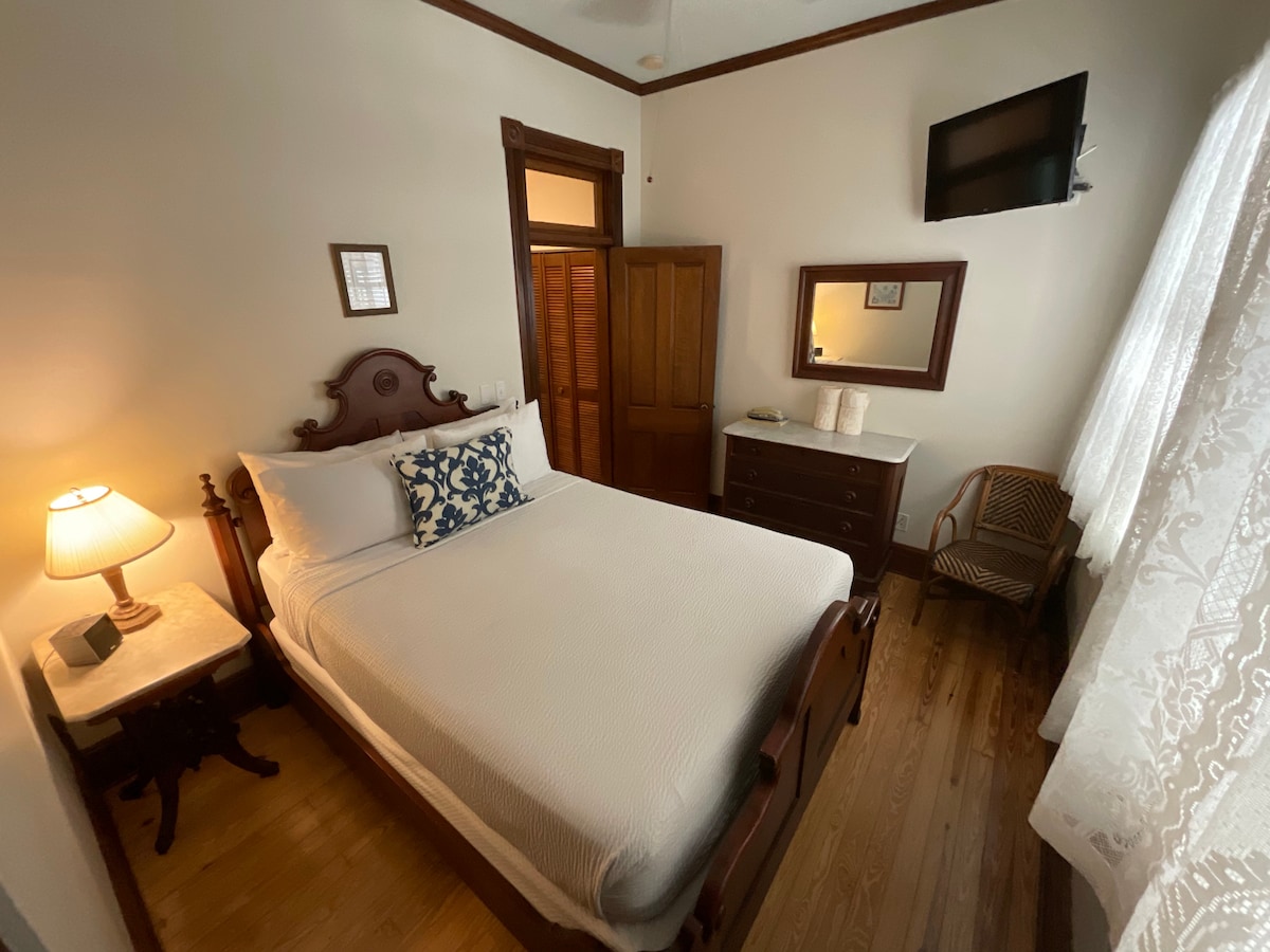 Adult Only Boutique Hotel (21+). Experience the grandeur of the stately Victorian home, thoughtfully updated and lovingly converted into a boutique hotel. This room features one king bed and a full private bath located on the second floor of the mansion. This room is home to the largest veranda in the house and provides guests with a fantastic view of Fleming Street - perfect for relaxing, people watching, or enjoying a drink as you unwind. Also features a room with closet for extra storage.