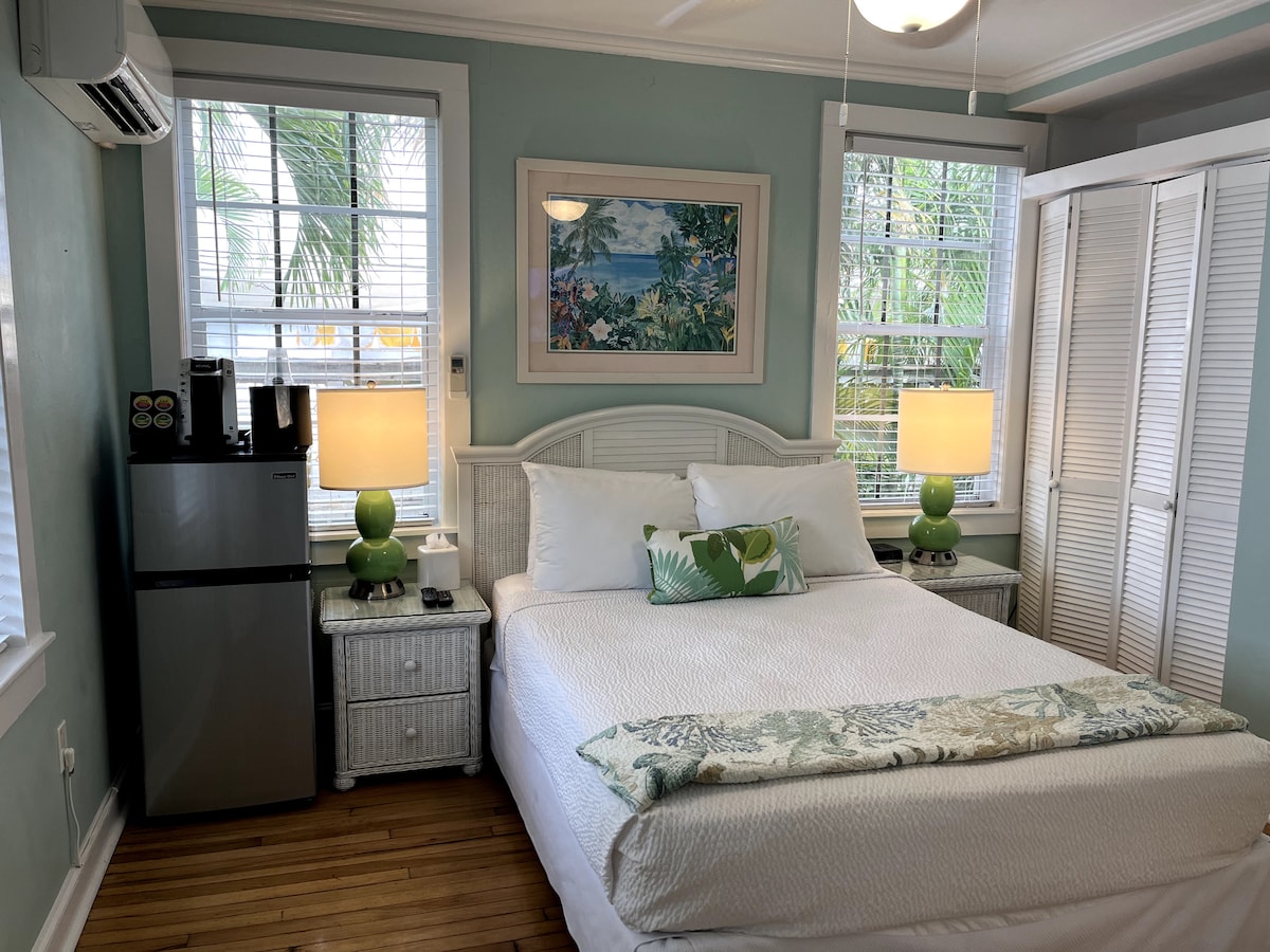 ***21 and up*** Enjoy this charming hotel located 2 blocks from the Historic Wharf and 4 blocks to Duval St. This room is just steps away from our main pool, and appointed with a king bed with a walk in shower, Keurig coffee maker, TV, patio, and mini fridge. Perfect romantic getaway for 2! It shares a small patio with the neighboring room. Our property sports 2 pools, lush gardens, sitting areas, complimentary breakfast, and all the amenities you would need to enjoy Key West!