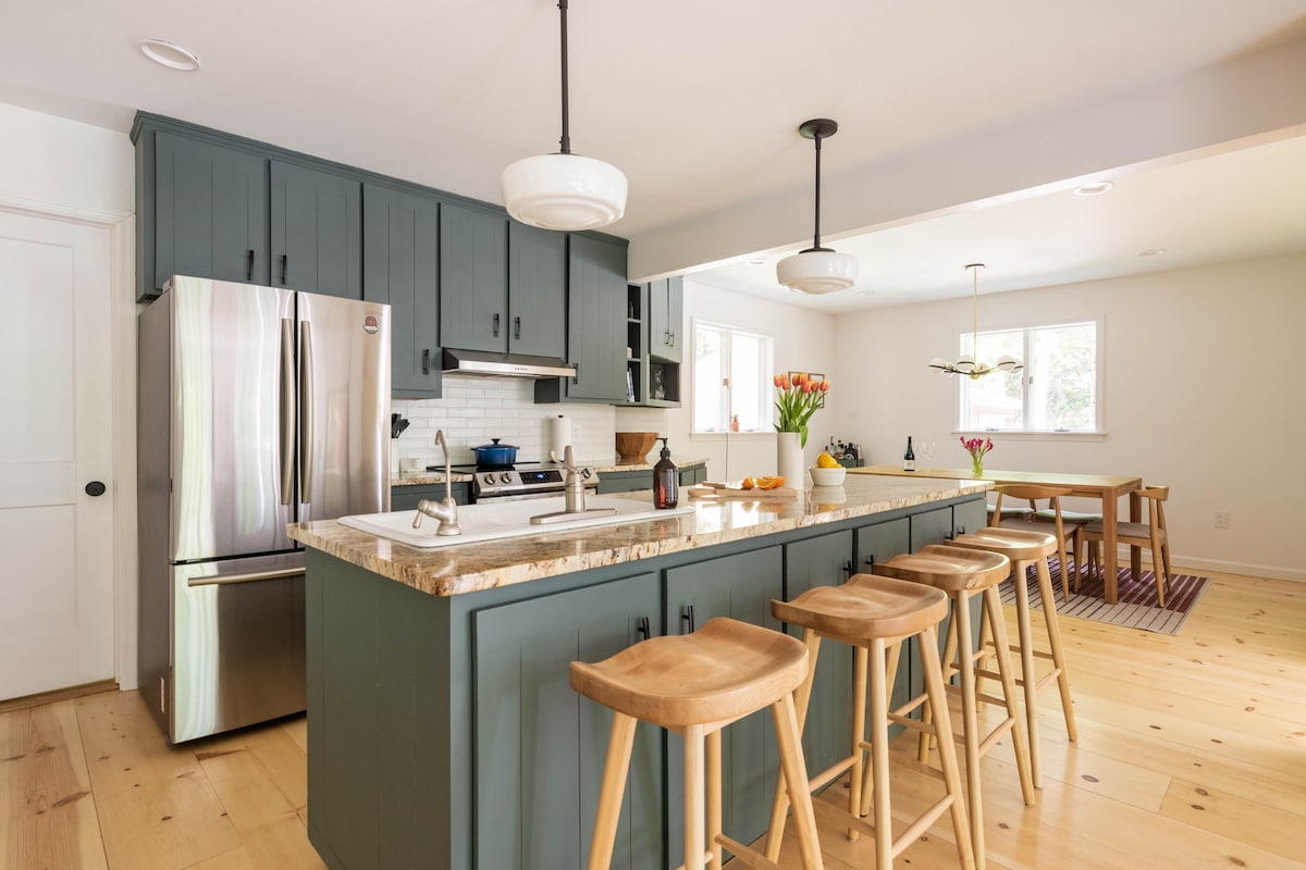 The best of modern designed paired with authentic historic Kingston bones. The house features 3 full luxe baths, HUGE new chef's kitchen with endless work surfaces - 3 ovens, and baking equipment galore. 2 full floors (+basement) offer room to cook and play, flowing from the kitchen to the dining deck to the hot tub deck. This freshly restored home will be your base camp for adventures, but once you come you won’t want to leave!Quiet workspaces, printer, choose your vibe to get work done.