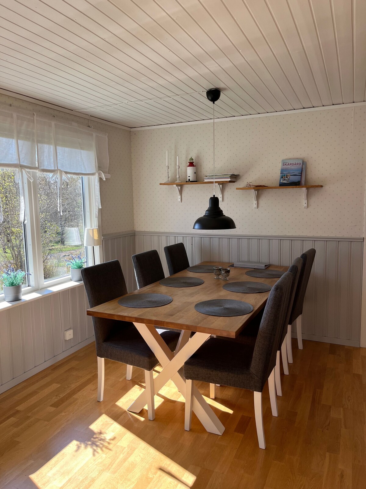 Charming 130-year-old cottage (90 m²) with a modern yet cosy feel. Two renowned spas (Yasuragi & Skepparholmen) within walking distance. Bottom floor: kitchen and dining area with classic wood stove, living room and bathroom. Your own garden and spacious wooden deck—perfect for sunbathing or BBQs. Set in a beautiful area with a crystal-clear lake for bathing just 200 m away, with a nature reserve surrounding it. Sea dock ~700 m. 30 minutes to Stockholm by Waxholm boat, bus or car.
