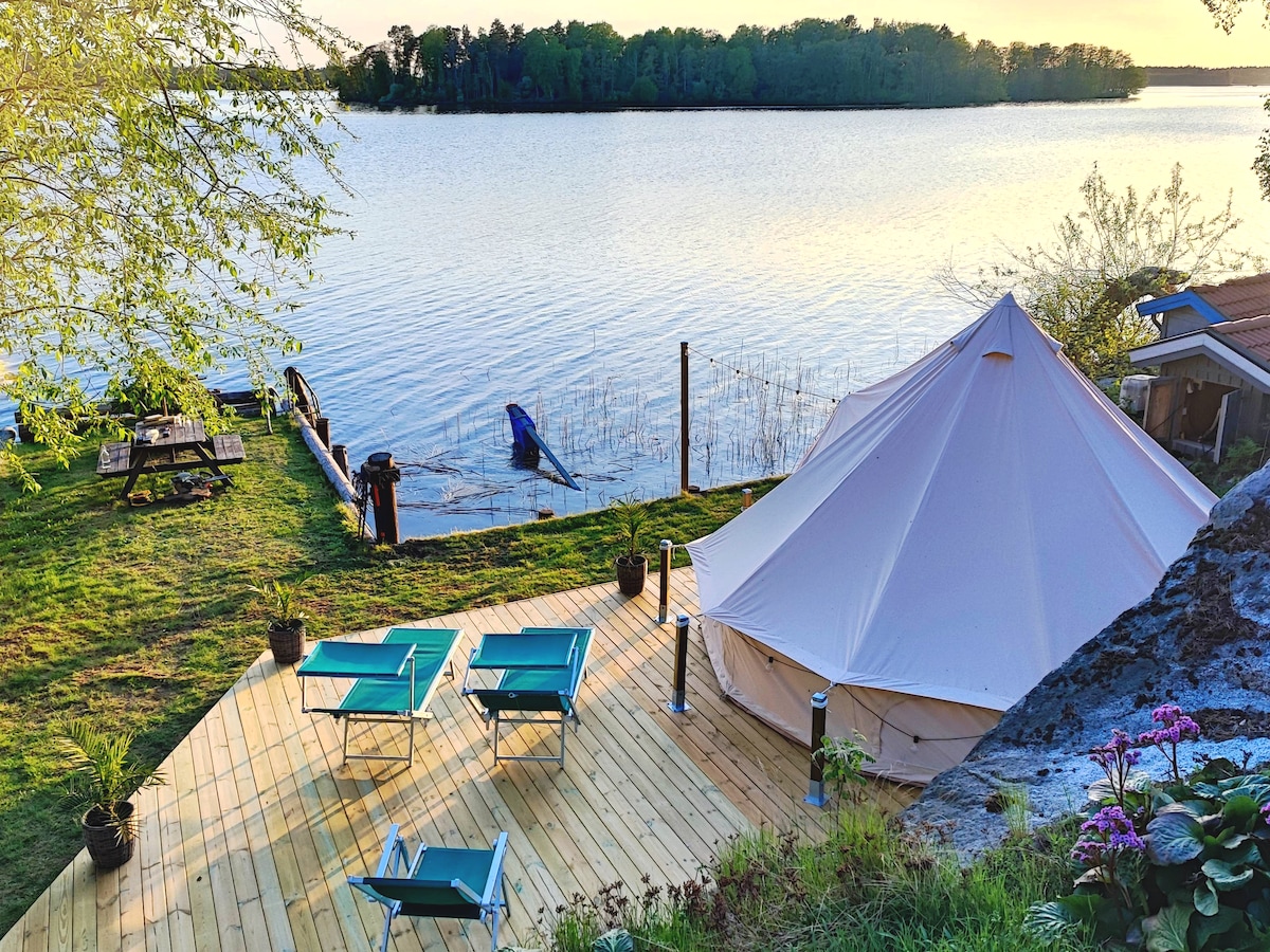 Unik lyxig glamping med fantastisk utsikt. Bo granne med konstnären Fredrik Skölds alteljé i en avskild del av trädgården. Njut av naturens ljud och en fantastisk utsikt, eller låna en gitarr eller trumma. Fem minuters promenad ner till sjön där det finns badbrygga och bastu och kanot. Laga din mat på grillen vid tältet, eller i det gemensamma ute-köket. Traditionellt utedass. Ibland kan chill musik höras från ateljén. Ett alternativ är Chillbilly Cabin, eller om ni vill ta med vänner.