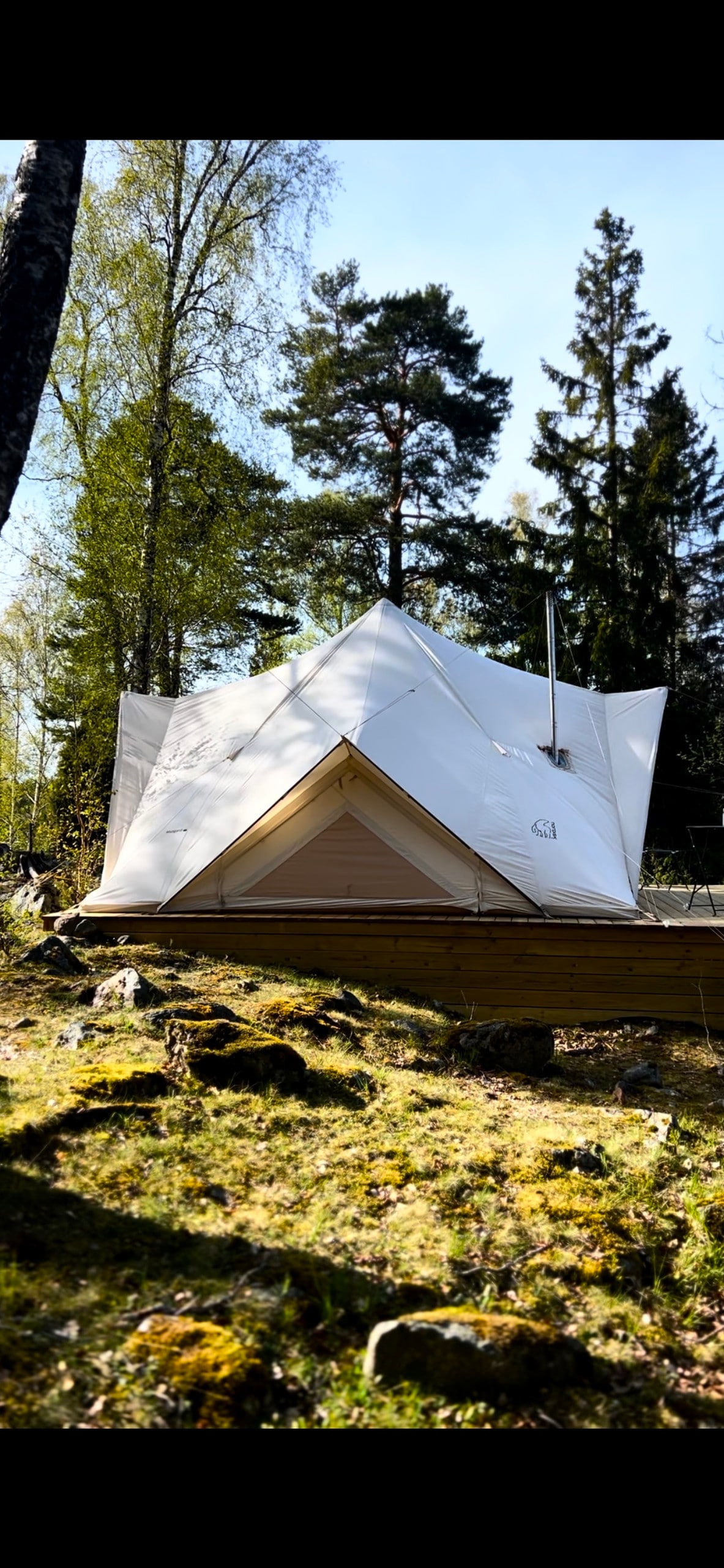 Njut av naturens ljud på detta unika ställe mitt i skogen nära Roslagsleden. Ni är helt själva i ett stort 38 kvm glampingtält. Det finns flera fina sjöar runt omkring och blåbär, svamp och lingon att plocka. Ni tar er hit via Roslagsleden etapp 5 eller via buss 621, 626 från Danderyds sjh eller Åkersberga. Promenaden är sedan ca 3 km. Parkeringsplats för bil finns också som alternativ