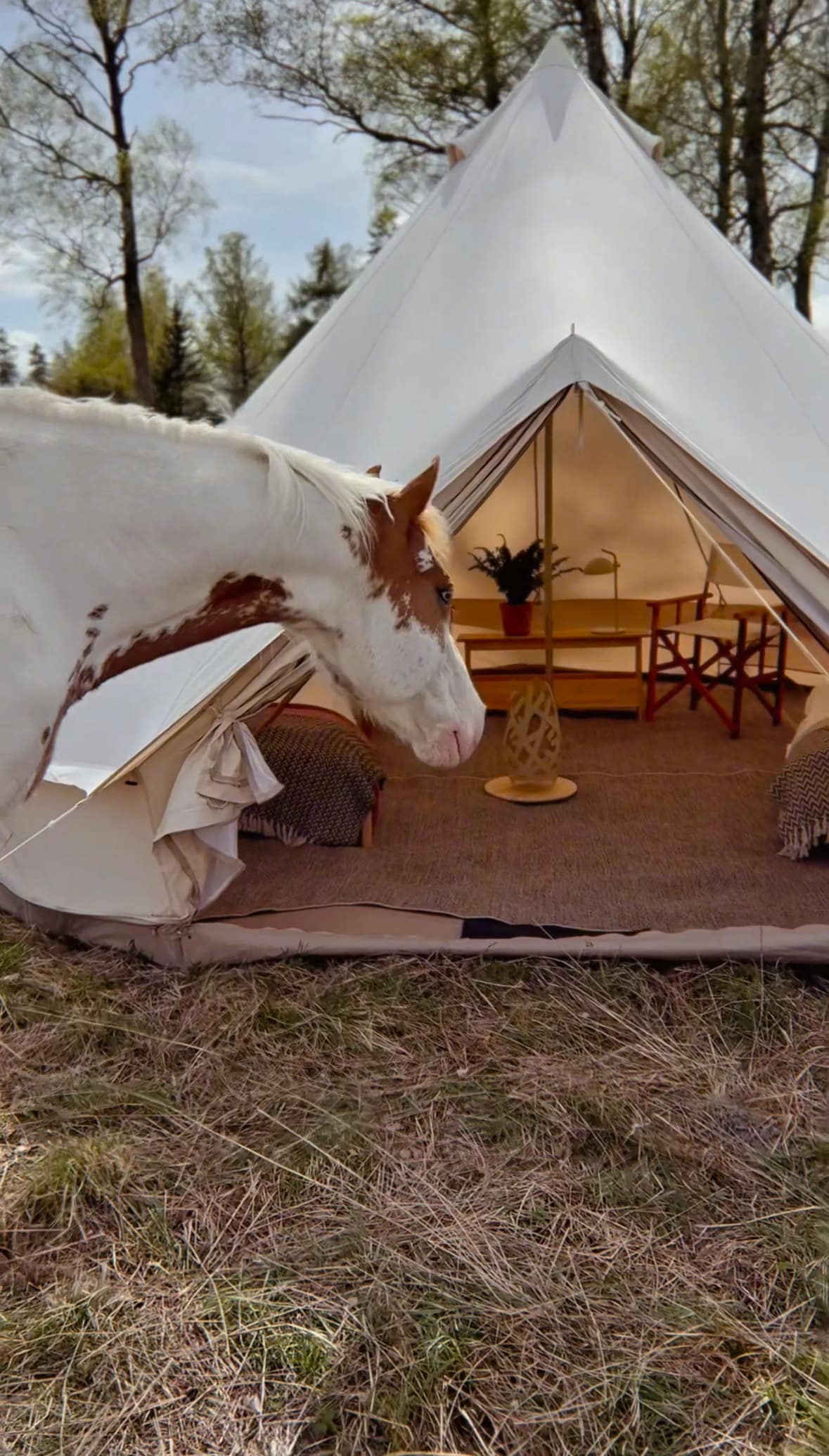 Kom närmare naturen på denna oförglömliga tillflyktsort. Glampa med vildhästar ! Ert tält är placerat på en underbar kulle mitt i hästhagen. Med ett 20-tal unghästar lekandes utanför det trygga trästaketet sover ni skönt i tältet som är inrett med en stor säng och sittmöjligheter. Utanför finns en köksdel med gasolgrill och långbord. Det finns ett eget dass på området. Ni har även tillgång till vår gård och hälsa på alla djuren som bor där. Hästar, kor, får, höns, kaniner och alpackor.