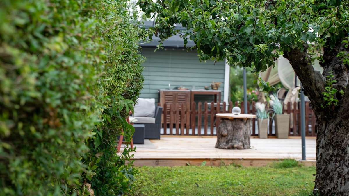 Welcome to our newly built tiny house! This house is perfect for a family with two kids or if traveling with friends. You sleep in a separated bedroom area (80+80cm bed) and loft (80+80cm bed). There is a well equipped kitchen and a bathroom with shower/toilet and washing machine. You have access to free internet and built in speakers. It has great communications to City Center. Close to subway Fruängen and a bus stop just outside the garden. Only 15 min from Stockholmsmässan/Stockholm fair.