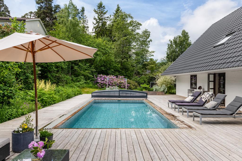 Arkitektritad villa i sommaridyll med sjöutsikt