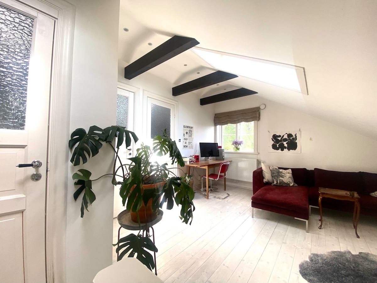 Centralt beläget nära både bad, natur, restauranger och innerstan. 70 m ner till kanalen med fina promenader längs vattnet. Matrum, kök och vardagsrum i öppen planlösning, 3,20 i takhöjd med stora fönster mot innergård. Ett sovrum med dubbelsäng och ett med sovloft (stege). Möjlighet finns till extra madrass. TV med många appar, wifi och bluetoothhögtalare. Två grönskande uteplatser med soffa och matbord för härligt utehäng. Vid kallt väder finns värmare. Lugnt och tyst läge nära tvärbanan.