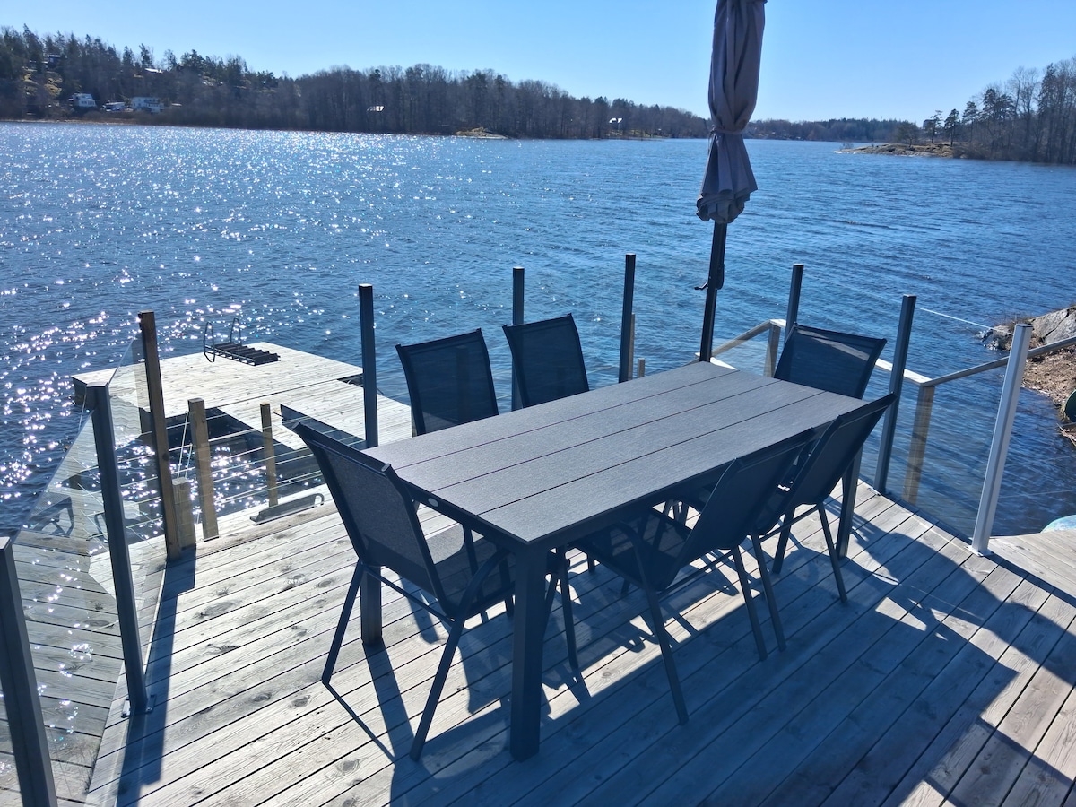 House by the sea on a jetty👍Enjoy the hot tub and wood-burning sauna. Fantastic outdoor environment. Modern and fully equipped house, tastefully decorated. Perfect experience for those who want to have a relaxing and beautiful time on the water🌞 If you want to be active: canoe, hike in the nearby national park, go for a run or go boating. All this just 30 minutes from Stockholm! Imagine spending a few days or weeks in this environment 😀 - All space is privately available to you as guests.
