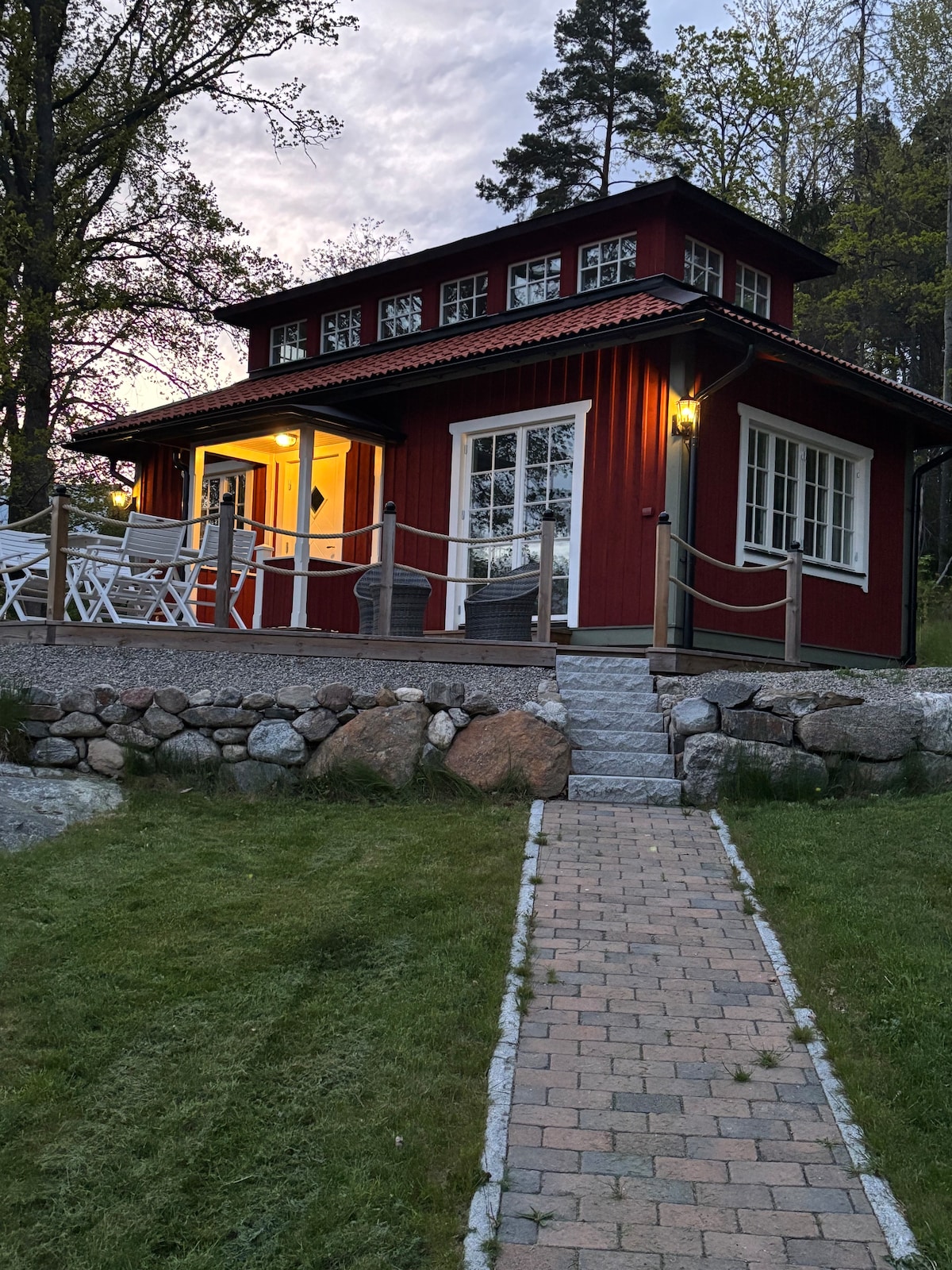 On our premises, we have a genuine village bakery house from the 18th century. Modern standard in a country style atmosphere, with a bathroom, kitchen and sleeping loft for two. Private entrance and a veranda for evening dinners. This is a great base to explore the area either by foot, locally, or by car across the Archipelago. Stockholm by ferry was so easy. If you want to self-cater, the supermarket is only 3 minutes walk away if