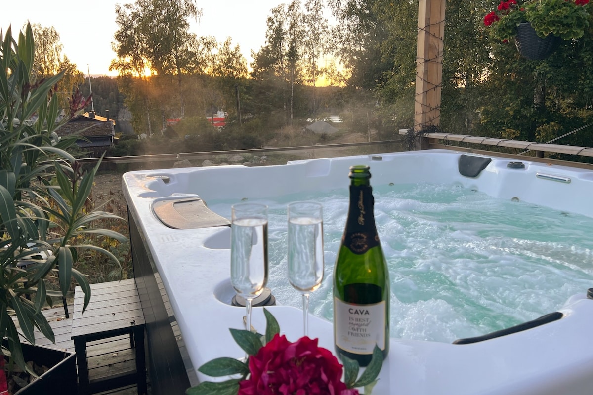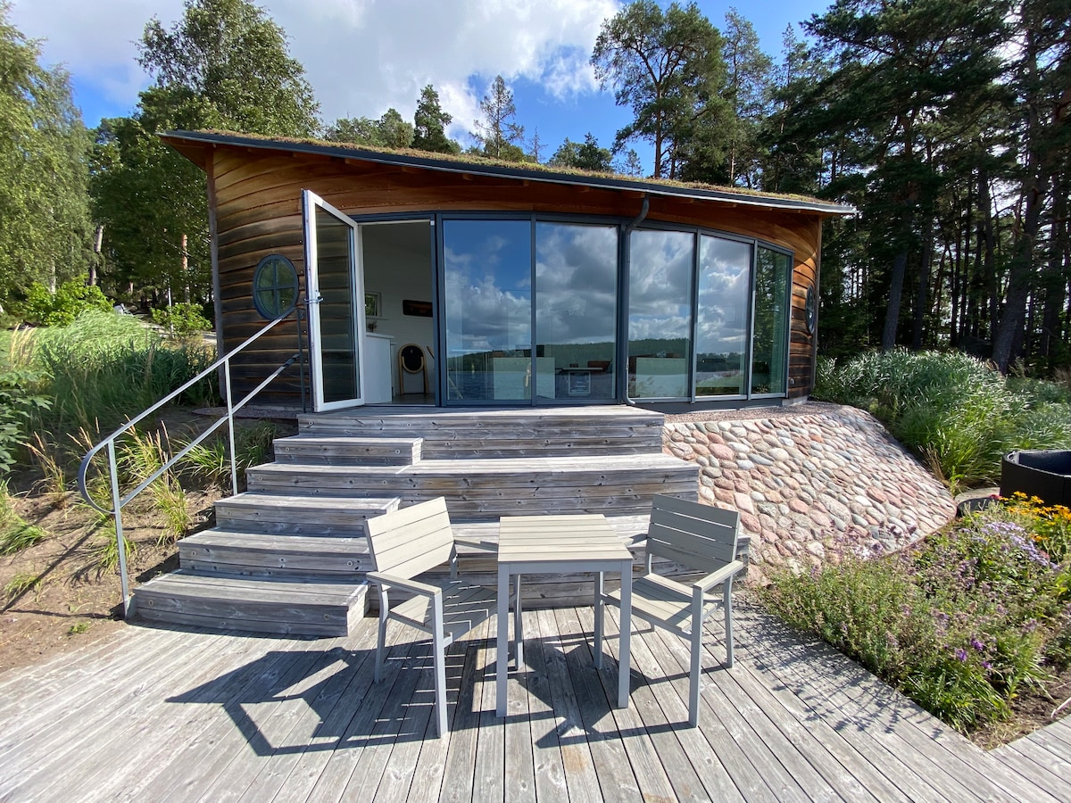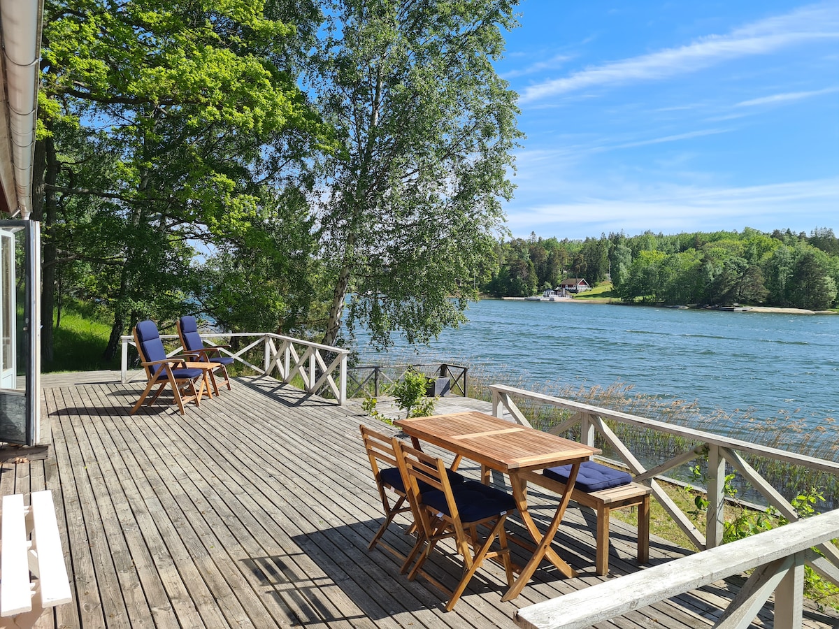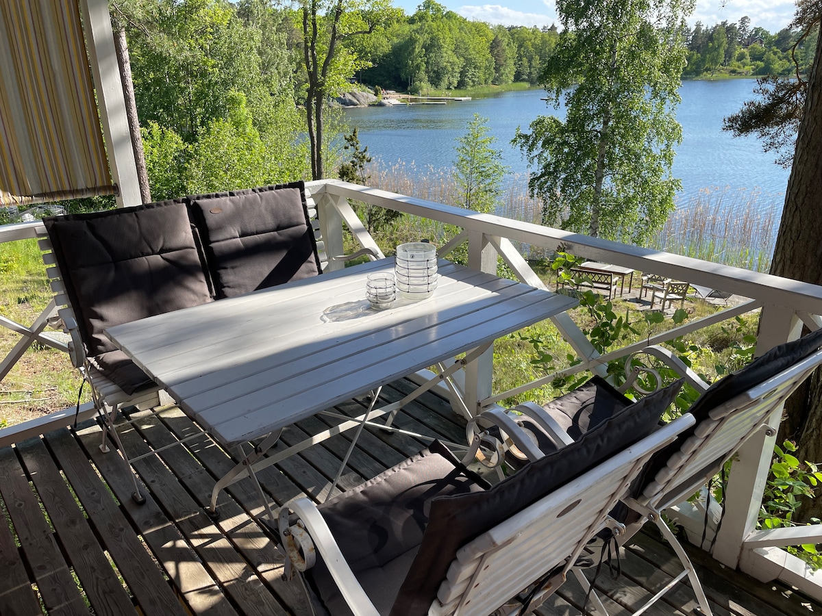 Ett boende med fantastiskt läge vid havet endast 10 meter från vattnet. Med utsikt över Stockholms inlopp ser du båtar och fartyg passera utanför huset som har en terass mot havet. Stugan ligger endast 12 km från centrala Stockholm och ligger avskilt från huvudbyggnaden där vi själva bor. Naturreservat för promenader och löpning ligger ett stenkast från stugan. Den vedeldade badtunnan som står på vår brygga går att hyra för en kväll. Det finns möjlighet att hyra havskajaker (2 st).