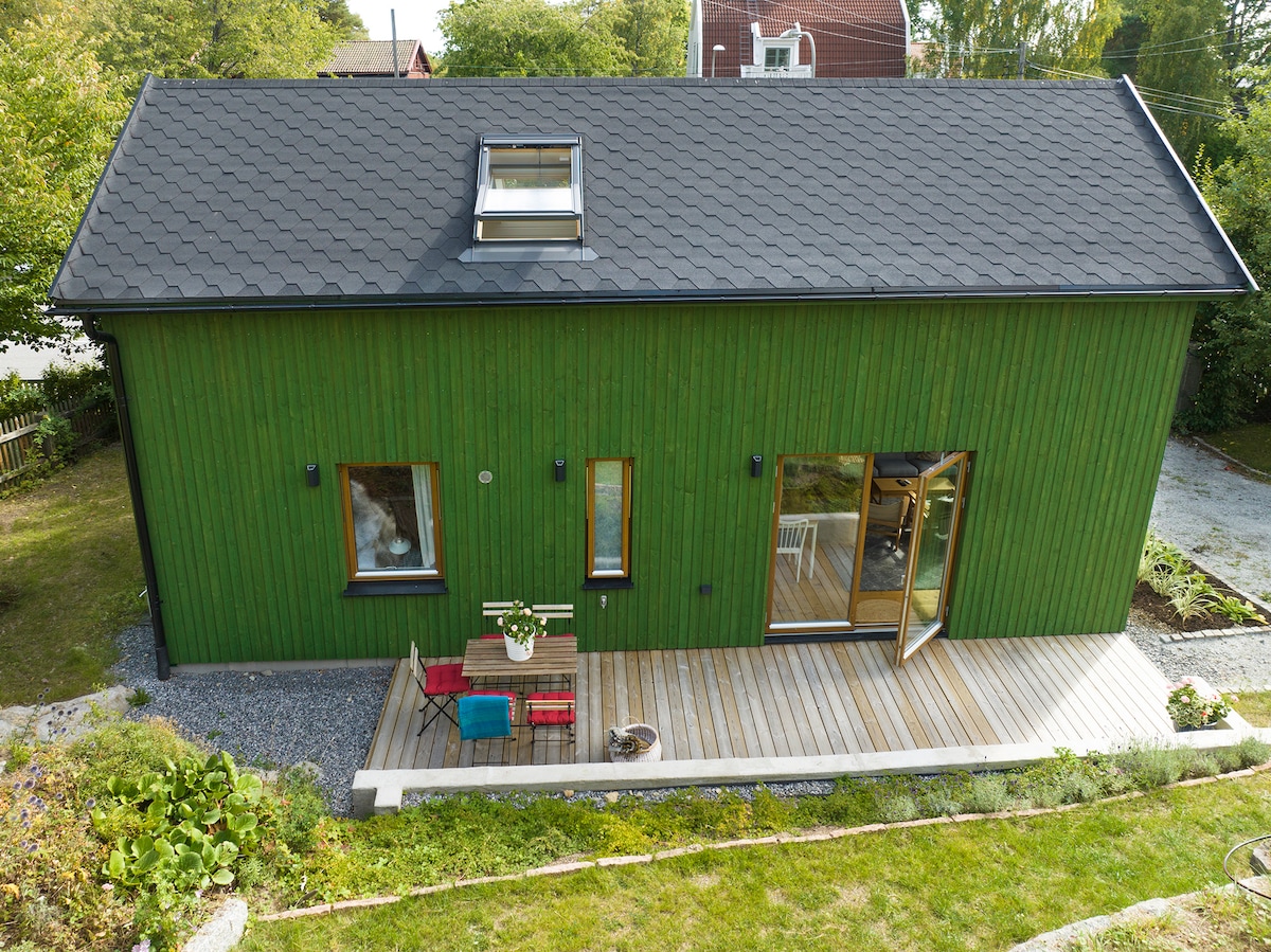 Welcome to our new (2023) ecological house with a calm and clean character with a ceiling height of 5 meters. The house is characterized by a space of air in combination with a large size photography collection on the walls. Dining area for the whole family on the wooden deck outside. Free parking with charger for 1 car. Quiet neighborhood about 5 km from Stockholm town, a 10 min walk to the subway station and 11 minutes ride to town. It is about 1 km to Lake Mälaren's natural areas and beaches