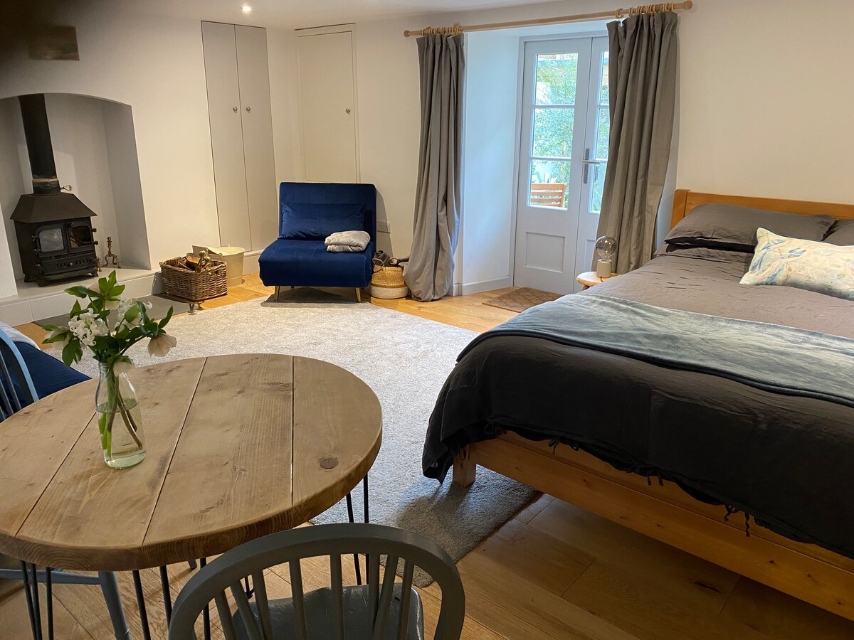 Welcome to Primrose Studio, a self-contained apartment on a quiet, private drive - just 2 mins walk to the centre of Totnes. Satnav won’t find us - our check in directions will ! Beautifully converted in 2021 - with slate/wooden floors with underfloor heating, wood-burning stove, bathroom with roll-top bath and walk-in shower, and a separate fully-equipped galley-kitchen. The studio has its own front door, with its own parking space right outside. Ideal for couples, we welcome family pets too.