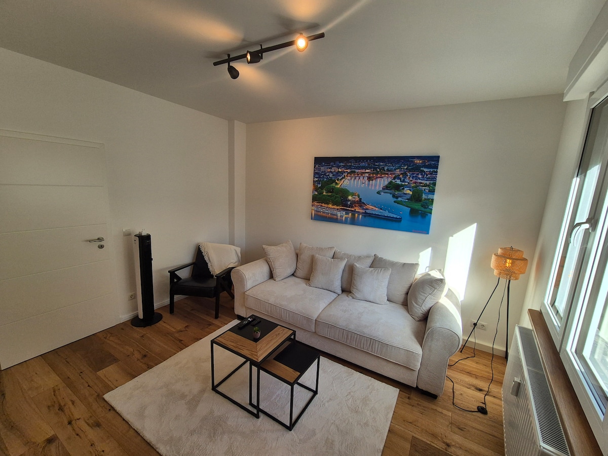 Modern eingerichtete Neubauwohnung mit Balkon und Aufzug im Herzen von Koblenz. Panoramablick auf die Herz-Jesu-Kirche. Am Beginn der Fußgängerzone und 2 Minuten zu Fuß vom Löhrcenter. Die Altstadt, das Schloß und das Deutsche Eck zu Fuß gut erreichbar. Die Wohnung umfasst ein großes Wohnzimmer mit Schlafcouch (Liegefläche 1,20x1,90m), eine Küche, Schlafzimmer mit Boxspringbett (1,80x2,00m), Balkon, Badezimmer mit ebenerdiger Dusche.