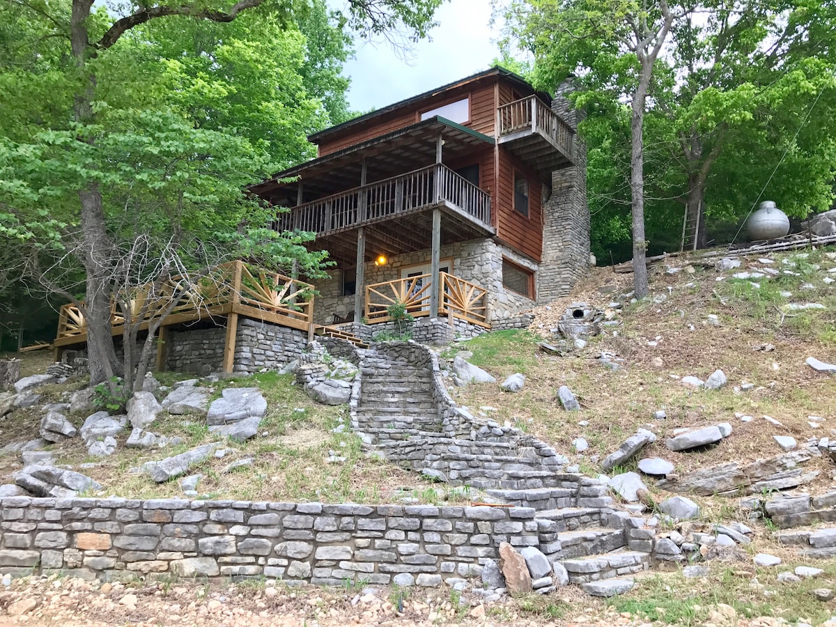 Take it easy at this unique and tranquil getaway. The High Noon Cabin is the 1st of three cabins being built on our beautiful property next to the White River. Everything in this off-grid cabin was hand made using locally resourced lumber and supplies. Enjoy the beautiful scenery throughout the year - sunrise to sunset. Located just 8 miles from the town of Mountain View where you can take part in our many local festivals, listen to music, or just check out the beautiful Ozark Mountains.