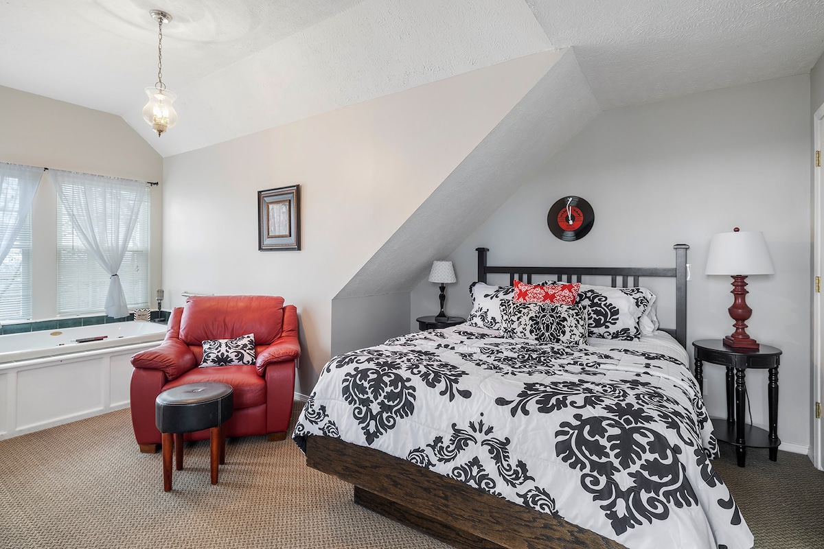 Welcome to the Heartbreak Hotel Room! The Heartbreak Hotel Room offers a comfortable and thoughtfully designed space for relaxation after a fun-filled day in Branson. Featuring a Queen bed, this inviting room requires one flight of stairs to access.