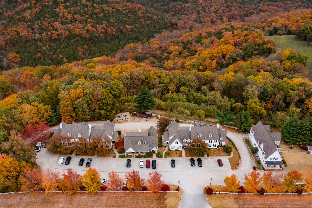 Welcome to the Rustic Hideaway Guesthouse at The Bradford! This spacious and inviting guesthouse features accommodations for everyone, with 2 Queen Beds, a King Bed, and a Twin-over-Full Bunk Bed, perfect for relaxing after a fun-filled day in Branson. Enjoy stunning views of the Branson skyline and the picturesque Ozark hills from the property. This unit is conveniently walk-in accessible, with a step-up onto the porch and into the building. It is a part of The Bradford Boutique hotel.