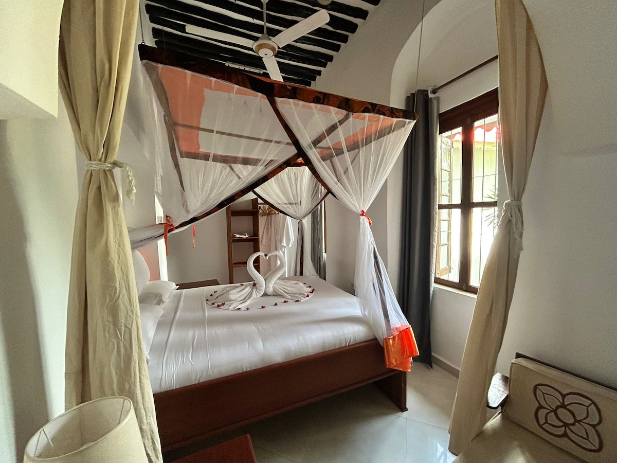 Overlooking our serene courtyard, the Zambarau Family Room offers a spacious double bed and a Swahili-style daybed, perfect for a third guest or a cozy lounge spot. Relax in the charming seating area with handcrafted Swahili furniture, ideal for planning adventures or enjoying room service. A baby cot is available upon request. The en-suite bathroom is spacious enough for a dance routine — your comfort, redefined in the heart of Stone Town.