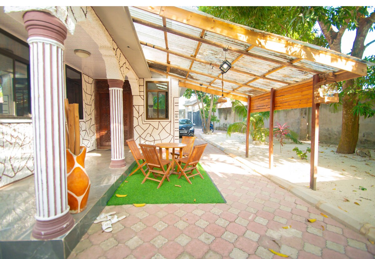 Experience the tranquility of this charming property, conveniently located on the ground floor. It is just a short 10-minute drive from both the airport and historic Stone Town, making it easy to explore the area. For your everyday needs, it is only a minute's walk to the main road, where you will find a variety of shops and local amenities nearby. Enjoy the simplicity and comfort this location offers, making it ideal for travelers seeking both relaxation and accessibility.