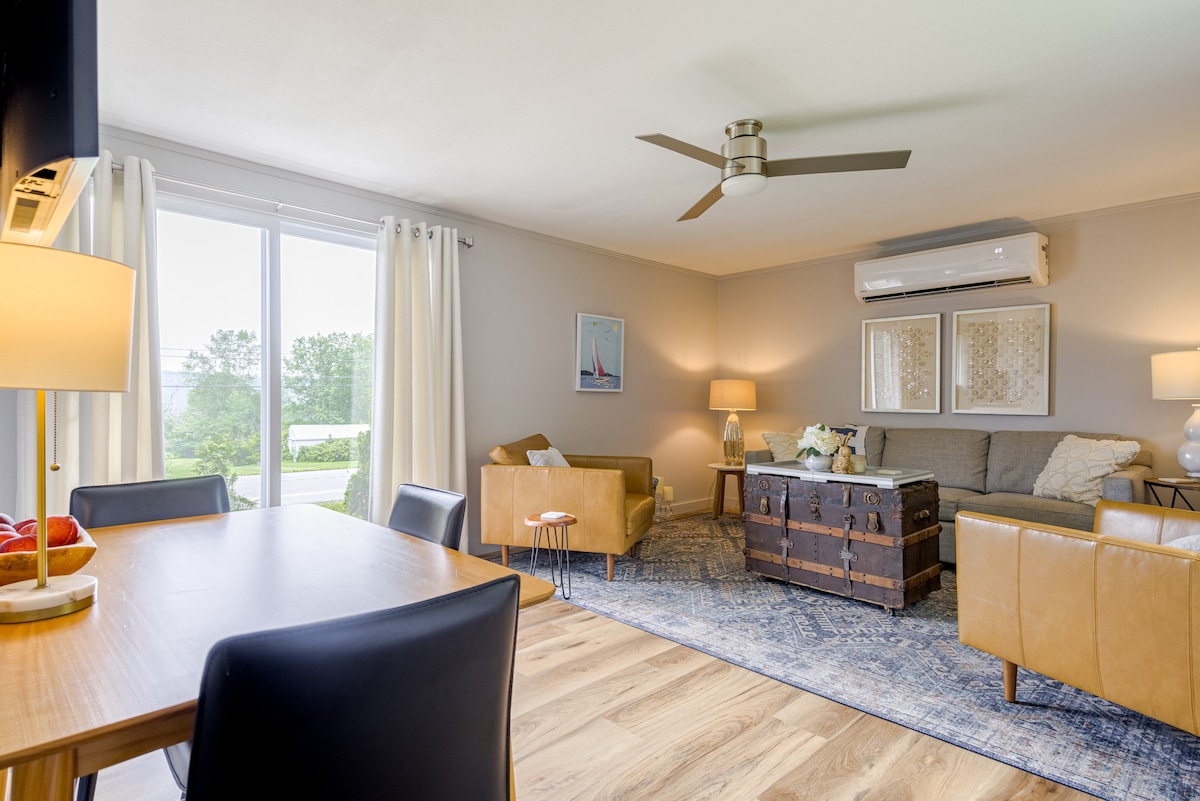 Escape to a romantic retreat with stunning ski-slope views just across the road. Cozy up by the outdoor fire pit, unwind in Adirondack chairs under the stars, or stay in for a relaxed night of board games. Enjoy peaceful mornings overlooking the mountains. Thoughtfully designed for couples, this private hideaway blends comfort, charm, and scenic beauty—perfect for ski weekends, quiet escapes, and unforgettable time together.