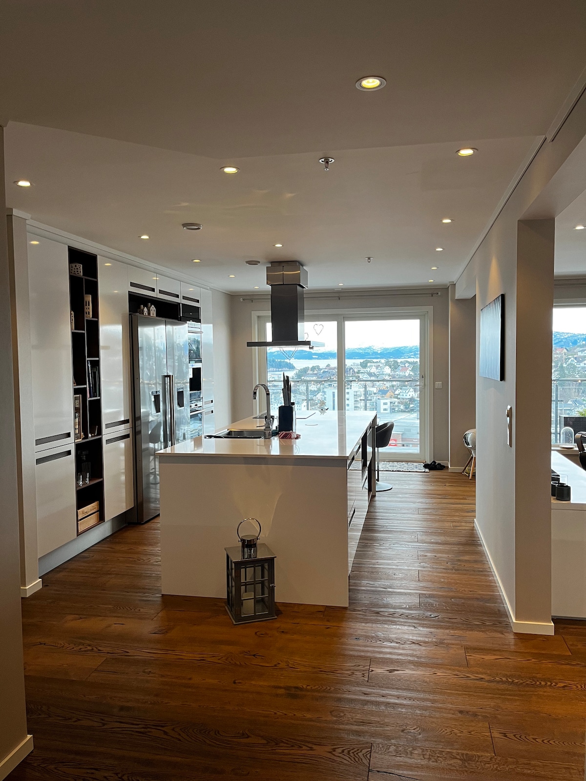 Moderne, lys, romslig og sentral leilighet i Leirvik, ligger rett ved kaikanten i Leirvik Hamn. Ligger i 4etg med heis. Parkeringsplass i garasjeanlegg. Egen TV stue med 85 tommers smart TV. Raskt internett. 2 store soverom med 180 cm brede dobbeltsenger.2 store balkonger. Gratis wifi. Gitarer både aukustisk og elektrisk, platespiller med forsterker og gode høytalere og wifi/bluethooth høytalere. Integrert kaffemaskin som lager nydelig kaffe av hele bønner. Ingen støy. Sprinkleranlegg