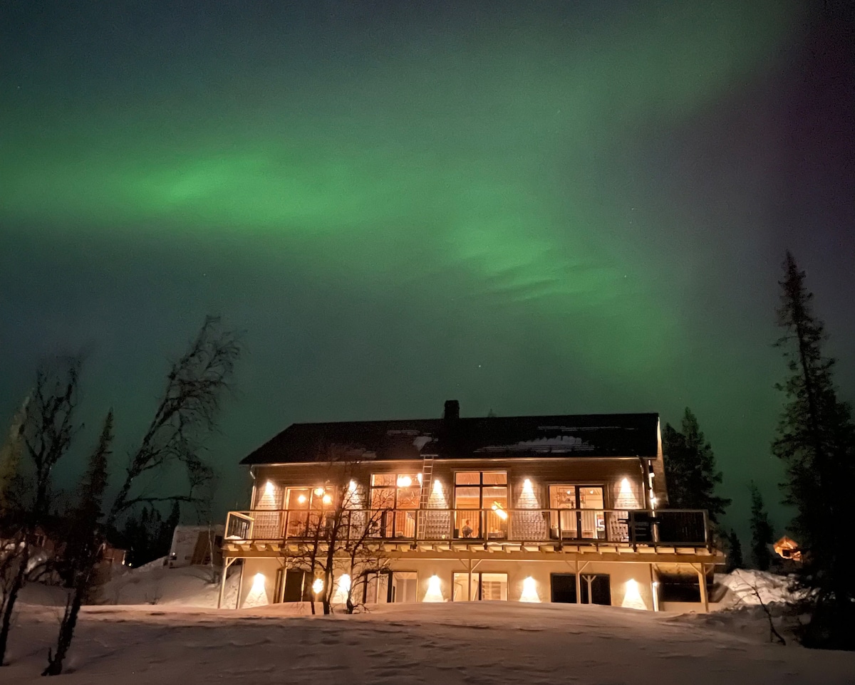 Magisk lodge i lugnt läge nära vandringsleder och med glidavstånd till skidåkning i både backar och spår. Efter en dag uppe på fjällen kan ni komma in för att basta, gosa ner i soffan vid öppna spisen eller njut av en middag runt det stora middagsbordet framför glasväggarna som ramar in fjällmiljön likt en stor tavla. Lodgen ligger nära Storhogna M där det finns restaurang, skiduthyrning, självbetjänande matbutik och bowling. 2 km bort finns högfjällshotellet med spa och fler restauranger.