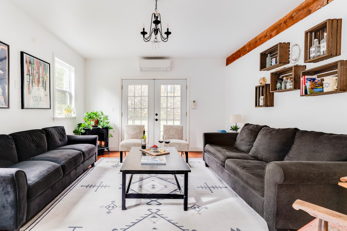 Situated on a tranquil road only 15 minutes from downtown Burlington and nestled in 8 acres of serene forest, our rustic farmhouse, Hearthwood, is designed to be like a charming boutique-style B&B. The house is split up with the guesthouse on one side and our family living separately on the other. The Forest Suite is one of our six elegant and fully private suites (each with its own private bathroom) available for guests to come to relax and rejuvenate. In addition to the suites, there is also a fully stocked gourmet guest kitchen kept filled with a wide variety of DIY breakfast fixings, a dining area, a laundry room with front loader washer and dryer, and a spacious living room for relaxing and dining. We also offer a large selection of indoor board games, outdoor sports games and even yoga mats upon request for your enjoyment while visiting. Guests also have access to our private forest with paths that meander through and expansive lawns with Adirondack chairs and a picnic table for enjoying your morning coffee or afternoon glass of wine. Our spacious suites are each newly renovated with high ceilings and serene forested views. Uniquely decorated with white shiplap, a blend of modern and antique furniture, they are designed to provide the experience of beauty, comfort and ease. Each has a deluxe pillow-top queen-sized bed, hand-scraped maple floors, comfortable arm chairs with throw blankets for journaling or curling up by the enormous picture windows, large closets, dark shades for sleeping in when you like, and tables for working or eating meals privately. They are furnished almost entirely with natural materials including soft cotton duvets, woven wool carpets, linen drapes and wooden hangers. They are also appointed with DirectTV, wireless internet (although not fast enough to stream movies), all linens, and towels.