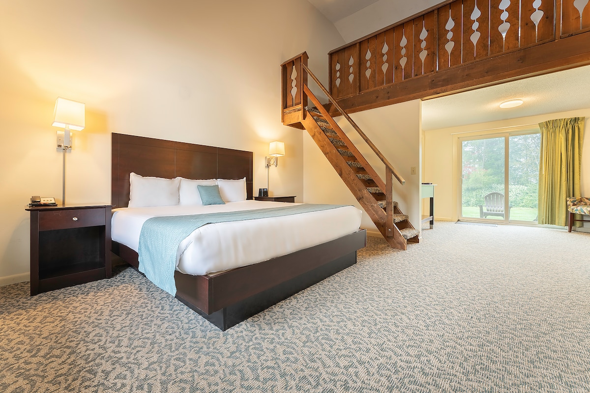 Embrace comfort in our King Junior Suite, nestled in both the upper and lower alpine areas of our property. Relax in your plush king bed, unwind in the spacious living area, or step onto your private porch to savor the peaceful ambiance of Cady Hill Forest. Enjoy top amenities like high-speed wifi, smart TV, mini-fridge, walk-in shower, and thoughtful extras for a perfect Vermont escape.
