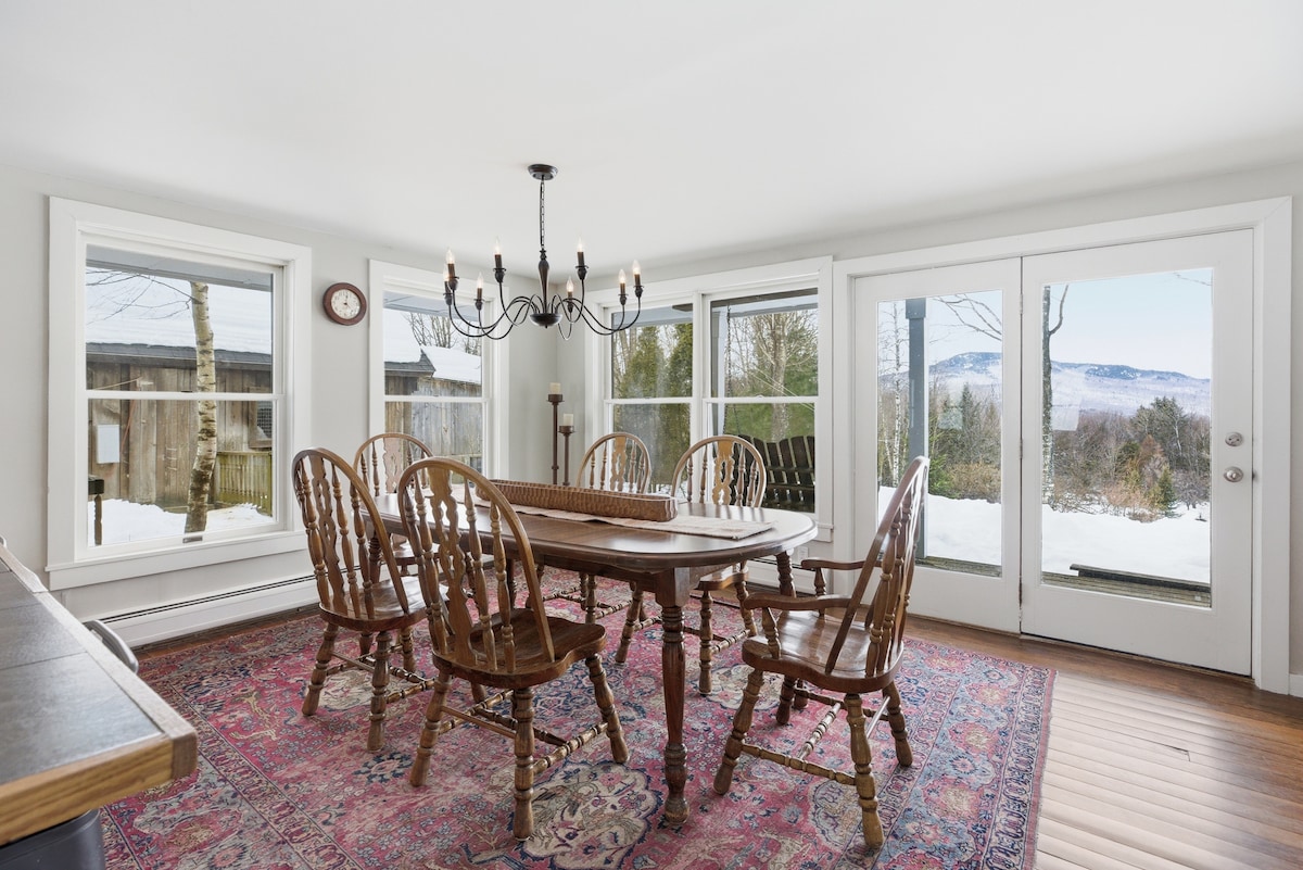 As featured in Conde Nast Traveler (1/21/22) Peaceful & impeccable retreat with a 180 degree view of Vermont's tallest mountains. Near Vermont's premier skiing, hiking, & outdoor adventures, you’ll love the sunset views and cozy atmosphere (huge sheepskin in front of the fireplace) and the attention to detail (live-edge wood details, spa-like bathroom). This is an incredible retreat for couples and families, adventurers and business travelers alike!
