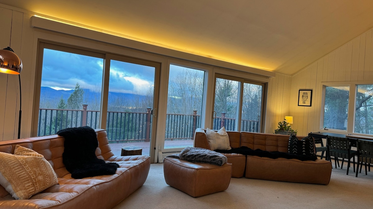 As featured in Conde Nast Traveler (1/21/22) Peaceful & impeccable retreat with a 180 degree view of Vermont's tallest mountains. Near Vermont's premier skiing, hiking, & outdoor adventures, you’ll love the sunset views and cozy atmosphere (huge sheepskin in front of the fireplace) and the attention to detail (live-edge wood details, spa-like bathroom). This is an incredible retreat for couples and families, adventurers and business travelers alike!