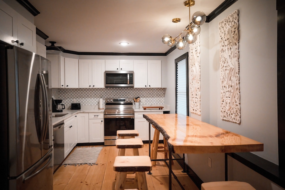 Welcome to The Summit House, a completely renovated A-Frame cabin less than 1 mile to downtown Stowe. Wake up to views of the morning light casting through the forest from your glass wall bedroom. Relax after a day exploring the mountains in the huge spa style rainfall shower. Settle down after dinner around the modern wood burning fireplace while watching your favorite shows on the 50" TV. It's not just a rental, it's an experience. The latest addition to the OM Home Residences collection.