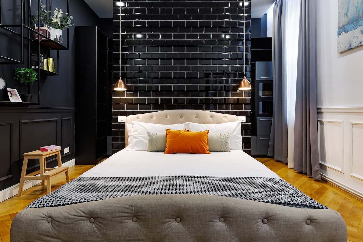Feel the Old World elegance in rooms with high ceilings, parquet floors, and period architectural features. Black accent walls and abstract art add a modern touch while other details evoke Art Deco. Step onto a narrow balcony for some fresh air. The apartment is a minute's walk from the famous Piata Sfatului and the Old City center. Walk a little farther to see the Gothic architecture of the Black Church