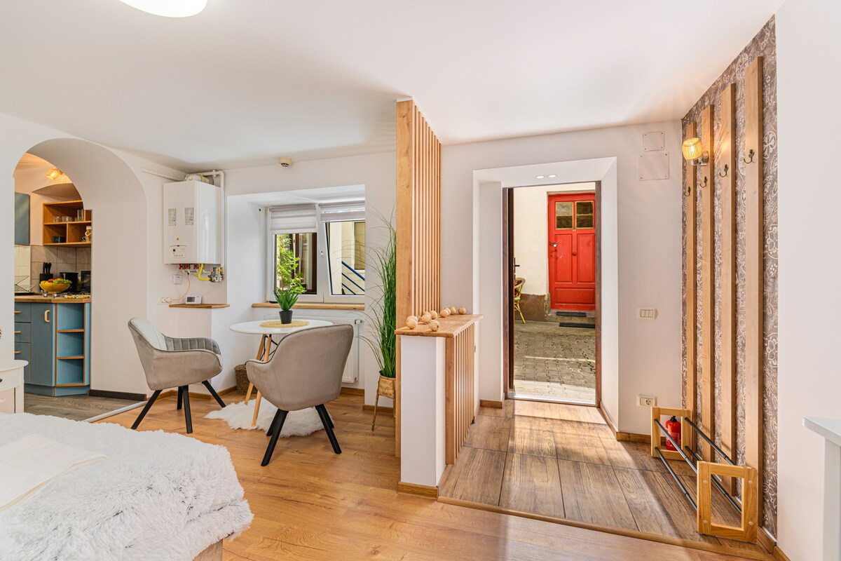 Cozy and spacious studio in the heart of historic Brasov Enjoy your stay in this cozy, large studio apartment located in a charming historic building right in the center of Brasov. The bright and airy living space features a comfortable queen bed, a bathroom, and a fully equipped kitchen — perfect for a relaxing and convenient stay. Just a few minutes’ walk from the city’s main tourist attractions, with easy access to the best restaurants, shops, and nightlife Brasov has to offer.