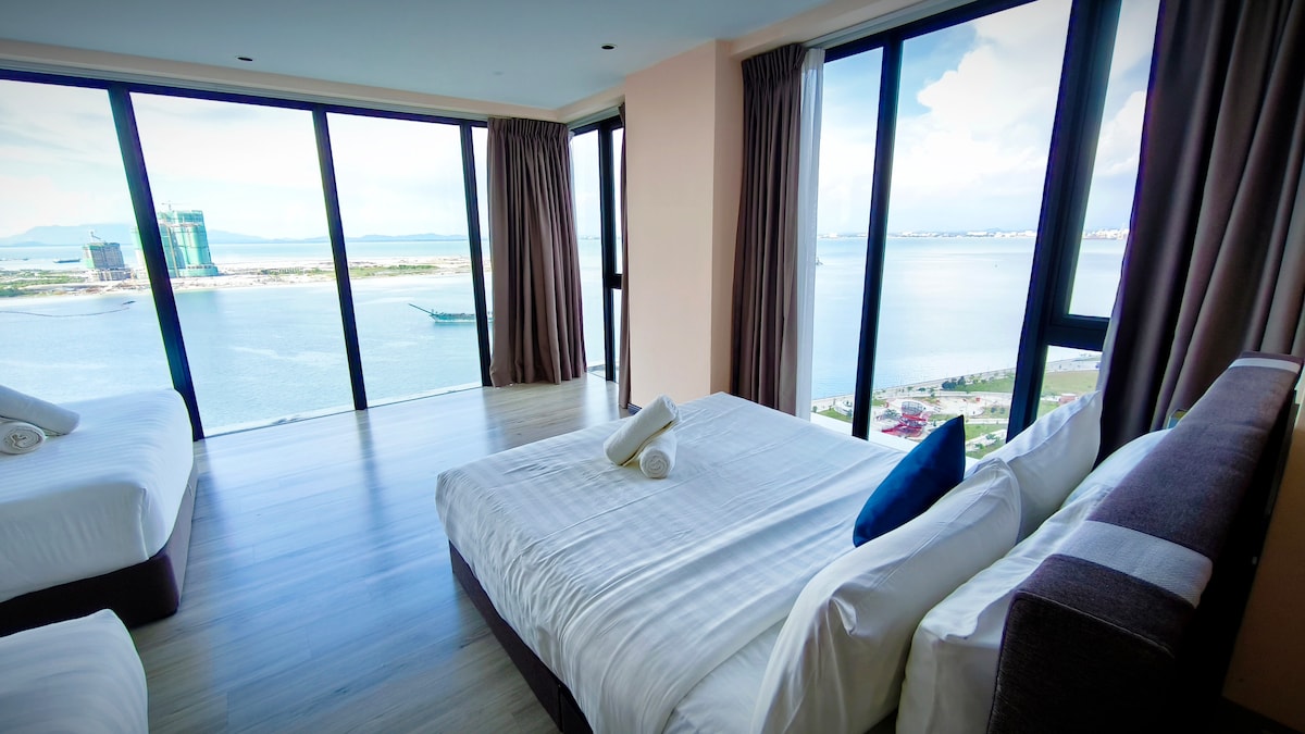 Coastal Serenity with Ocean View Welcome to your tranquil seaside escape at Seafront & Seaview_NordicHouse by Hanoverien Suites — a beautifully styled, light-filled space designed for comfort, relaxation, and unforgettable coastal moments. -Turn left to : Georgetown Tourist Attractions, Gurney & Pulau Tikus -Turn right to : Tanjung Bungah, International Schools and Batu Ferringhi beach. -Immediate adjacent to : International Schools at Straits Quay 槟城国际学校 국제학교 国際学校 こくさいがっこう