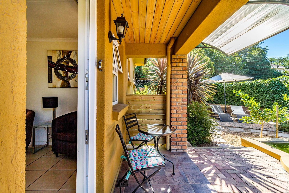 A tranquil indoor-outdoor living space ideal for couples or business travelers. The stylish studio opens up onto a large patio with braai. Enjoy our long summers outdoors! The studio has a separate entrance from the main house. Queen bed with open walk-in shower & separate toilette . It has fiber WI-FI, full DSTV, a tiny kitchenette with tea/coffee facilities, toaster, microwave, fridge & single induction plate. Secure onsite parking. We have 2 Small dogs for added security.