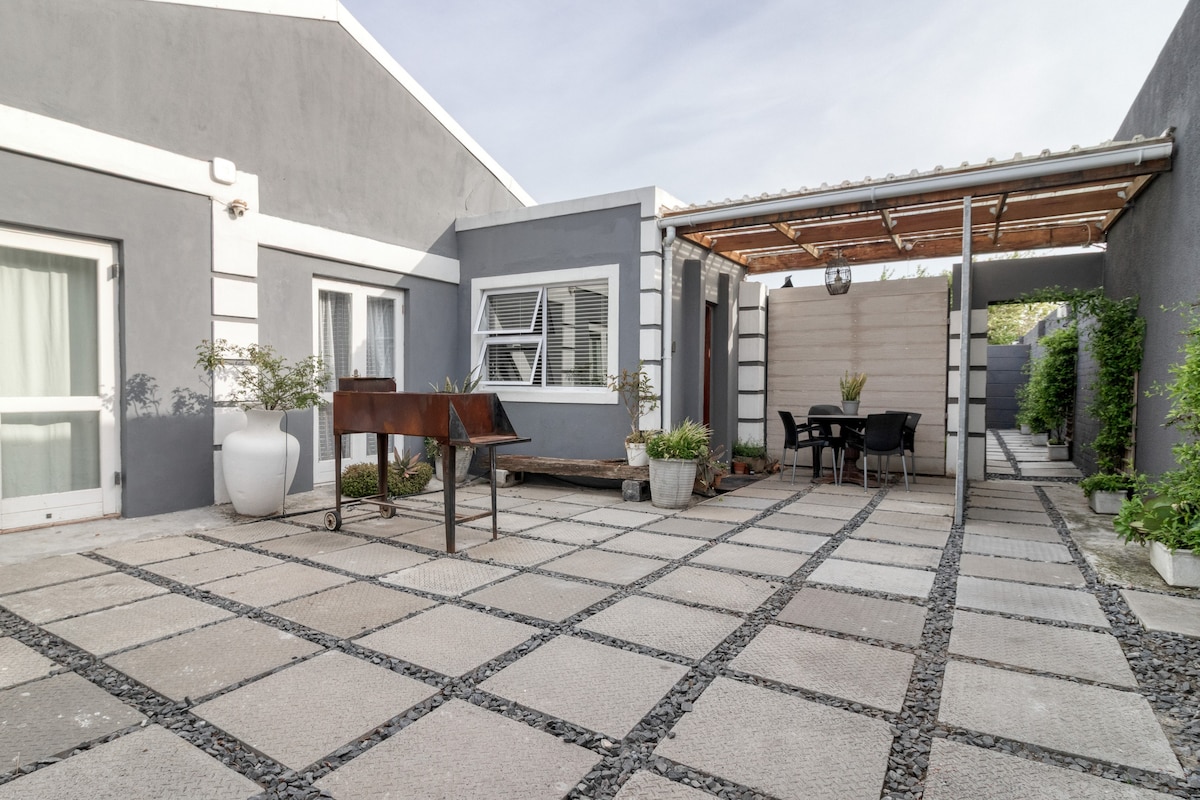 An ideal escape, our Studio is a private, self-catering garden unit located on the mountainside on a 300 Ha farm , with a pool (shared), & beaches closeby (15 min). Off the Grid - own power supply & fresh spring water extracted high in the mountains. Panoramic views over sea and mountain landscapes , surrounded by fynbos and wild birdlife , close to Capetown (55 km), airport, (40km) shopping amenities (7km) . Unwind after a busy day and relax at your private boma or around the pool.