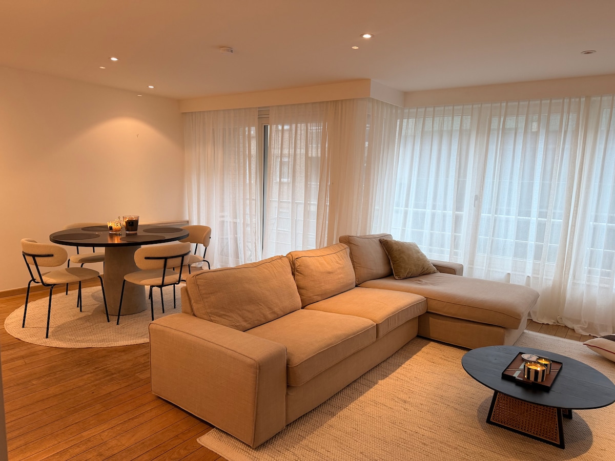 This stylish, spacious and cosy apartment is situated in the heart of the city. You have literally everything nearby: restaurants, shops, grocery stores,...and most of all: the sea and its wonderful beaches. Only 350 metres to reach the beach bars and other venues on the dike. It is well equiped and convenient: 2 bedrms, walk-in shower, big fridge and stove. The building has 4 stories, apt is on the highest floor, reached by the elevator. There is a TV with Chromecast, WIFI, a very comfy sofa.