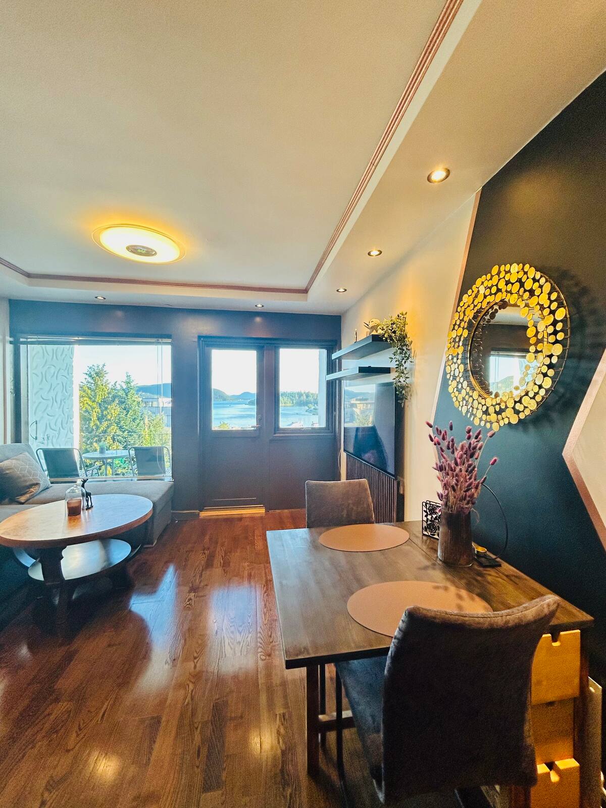 Beautiful house with all amenities! Four bedrooms with comfy beds, two full bathrooms with heated floors, a fully equipped kitchen, washer, dryer, and living rooms with large windows offering stunning fjord views. TV room in the basement, balcony with spectacular view, hot tub, and outdoor furniture. Close to Stavanger, grocery stores, and amazing hikes like Pulpit Rock. Welcome to our home!