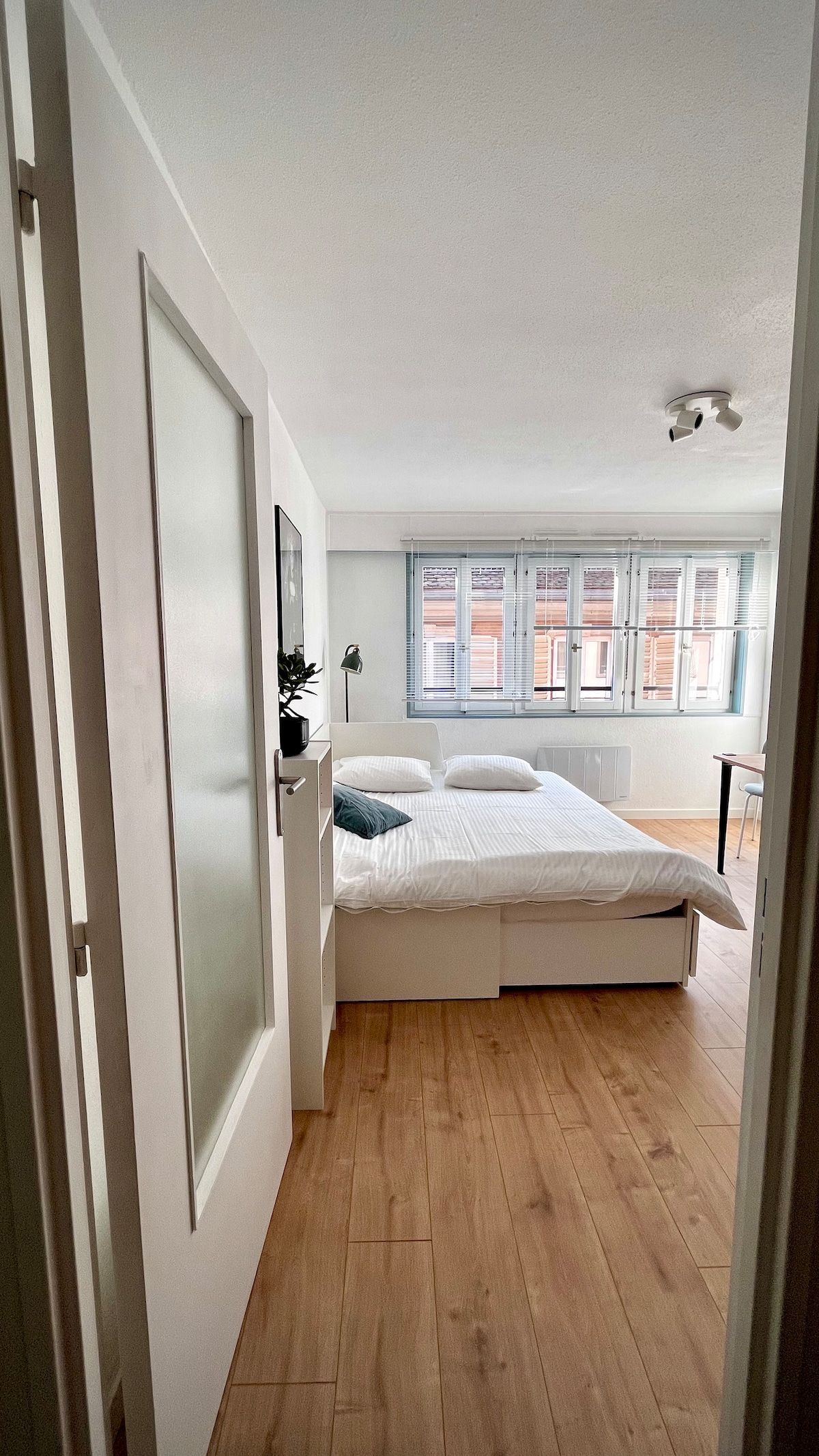 Non-smoking/Non fumeur. Studio de 16m2 refait à neuf, mobilier et déco neufs, dans magnifique immeuble historique en pierre de taille style néo-baroque, 5ième et dernier étage sans ascenseur, très calme. Idéalement situé en centre-ville à l’entrée de la Petite France en bordure de rivière, au pied du tram, et à 5 minutes de la gare TGV. Haut de plafond, charme poutres bois. Ce logement est parfait pour les couples, amis et voyageurs en solo, posez rapidement vos valises et soyez les bienvenus !