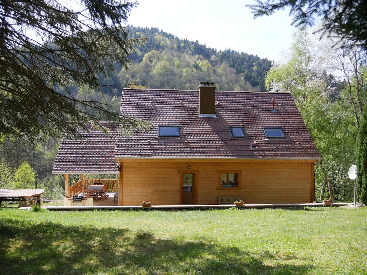 Chalet individuel, entièrement en bois. Confort moderne, cosy et chaleureux. TV,WIFI, parking gratuit. Situé dans une rue calme. belle terrasse à l'arrière du chalet avec barbecue, salon de jardin et chaises longues. Situé dans un magnifique cadre de verdure, idéal pour les promeneurs et les amoureux de la nature. Sa situation en centre-Alsace est idéale pour la découverte de tous les attraits touristiques de l'Alsace. Proche route des Vins, Europa Park, situé entre Strasbourg et Colmar.