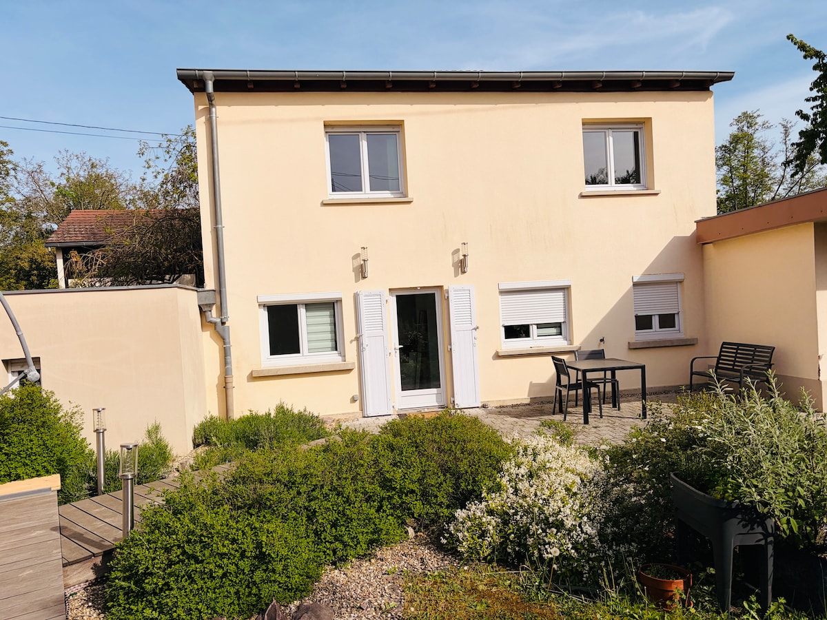 Located on the edge of the woods, in a charming little village, you can enjoy exceptional nature as well as a rich heritage between Alsace and Moselle. We will welcome you in an ecological wooden frame house with independent entrance, made with quality materials in a contemporary spirit, it has an independent terrace with pergola. The single-story accommodation is suitable for a couple with a young child or business travelers.