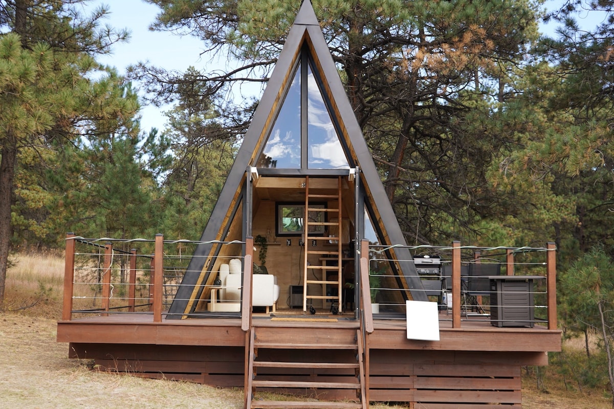 Escape to your own tiny glass A-Frame on nearly 10 acres of pine forest. Enjoy glamping comfort with a loft bed, pullout couch, Starlink Wi-Fi, hot tub, grill, and projector for movie nights. Huge front windows open to peaceful views and starry skies. Explore the property, play outdoor games, or relax by the fire pit. A shared kitchen and bathroom add convenience, located 150 yards away — just expect the full Colorado nature experience: fresh air, wildlife, and a few friendly bugs.