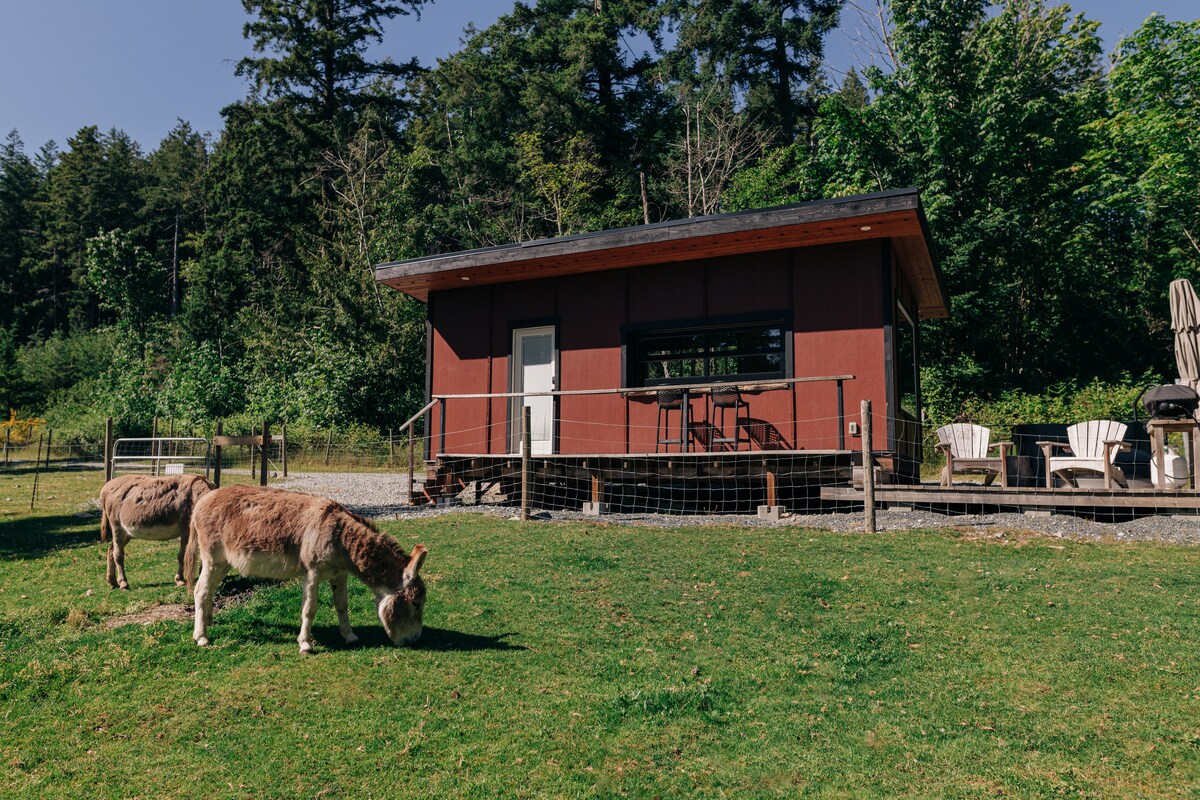 Tiny Tiny Home with huge charm on 5 acre hobby farm. Red Horse Farm is the home of 2 horses, 2 friendly dogs, a cat and happy chickens who roam around freely. Enjoy the peaceful energy of our beautiful companions. The property is located near forests and is surrounded by big fir trees. A place to unwind while sitting on the big covered deck or exploring the countryside. We are close to Nature Parks and beaches and 25 min to Mt Washington. To Courtenay is 12 min, Campbell River is 20 min away.