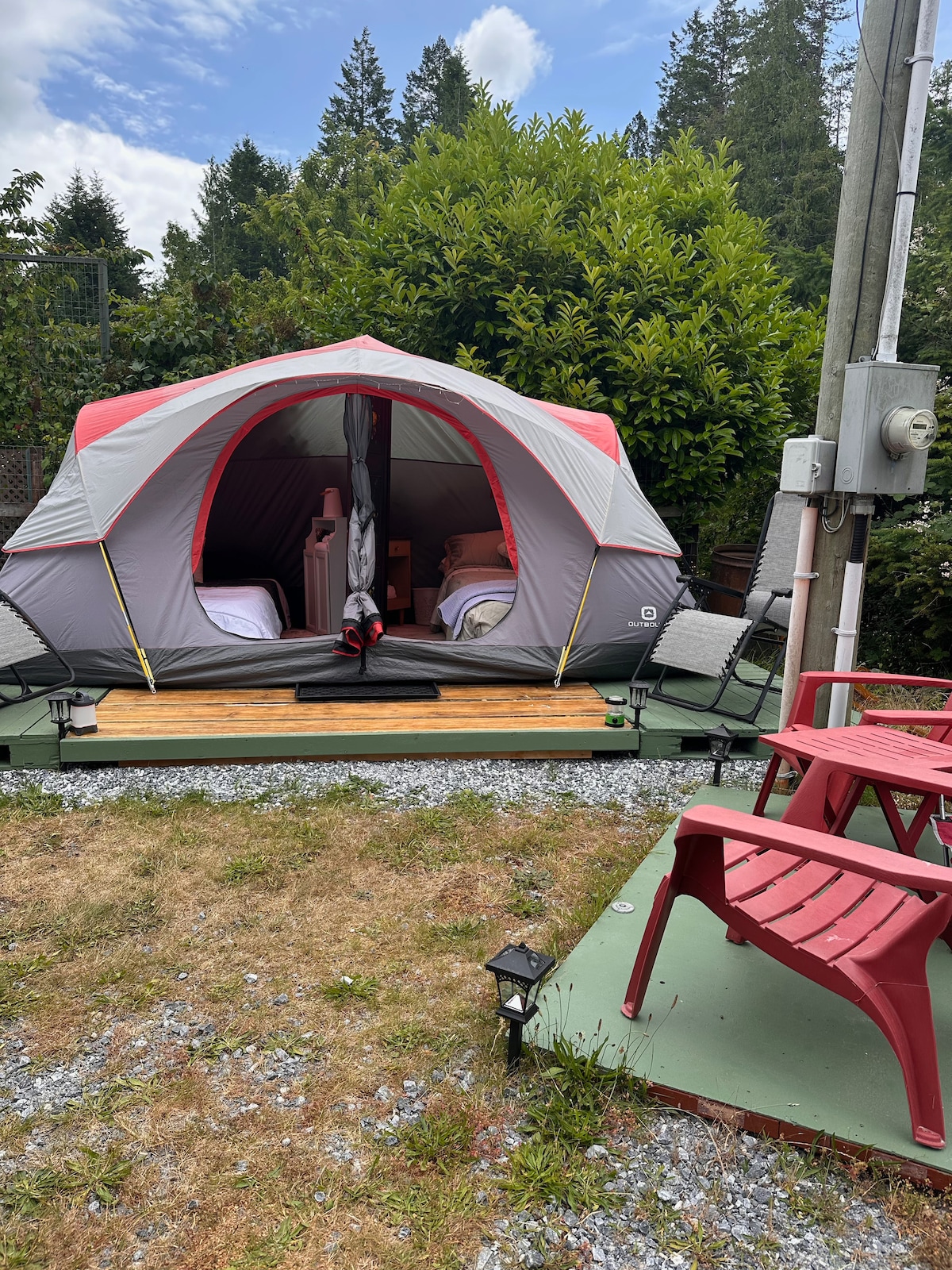 Lake views and nestled in the forest! * Min 2 nights on weekdays and 3 nights on weekends. * Lakefront property with 2 docks * EV charger * Use of Paddleboard and Sauna included! * 4 poster bed * 2 trifold mattress * private outhouse * water provided * private kitchen tent with a propane stove and table * propane firepit, picnic table & outdoor chairs. Ask us to rent kitchen tote, cooler, single mattress bedding OR Bring your own No electricity at the sites.