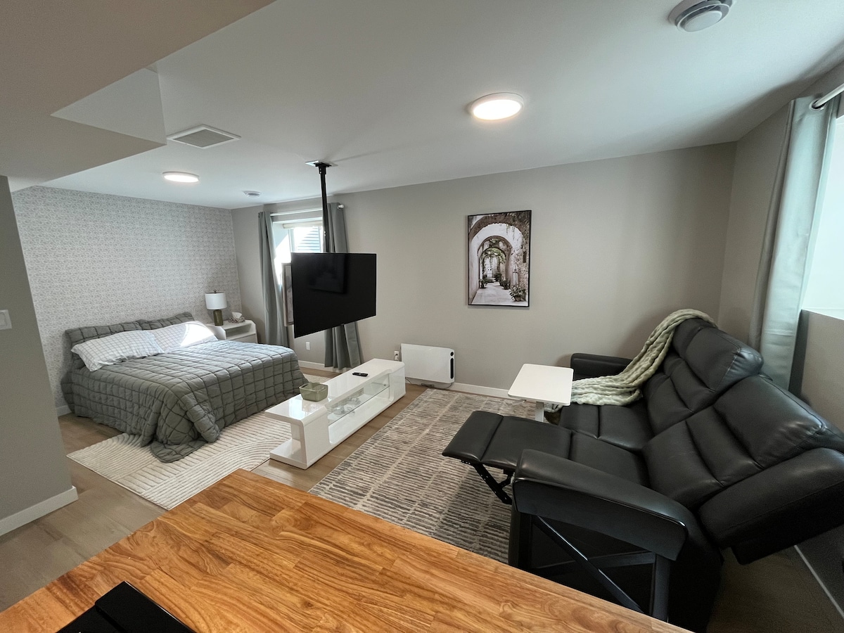 This private basement unit offers a perfect blend of modern living, spaciousness and comfort, with a main floor feel. It presents a welcoming atmosphere, perfect for entertaining guests or simply relaxing after a long day. The chef's kitchen boasts sleek stainless steel appliances, making cooking a joy. The bedroom is a cozy retreat with a king-size bed and numerous pillows for your comfort. This location provides easy & quick access to the int'l airport, local amenities, parks and more.