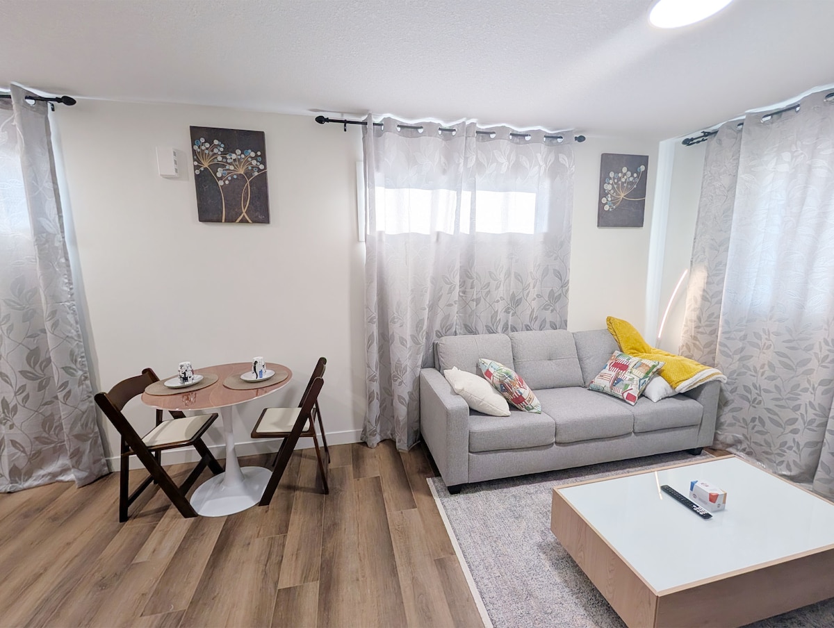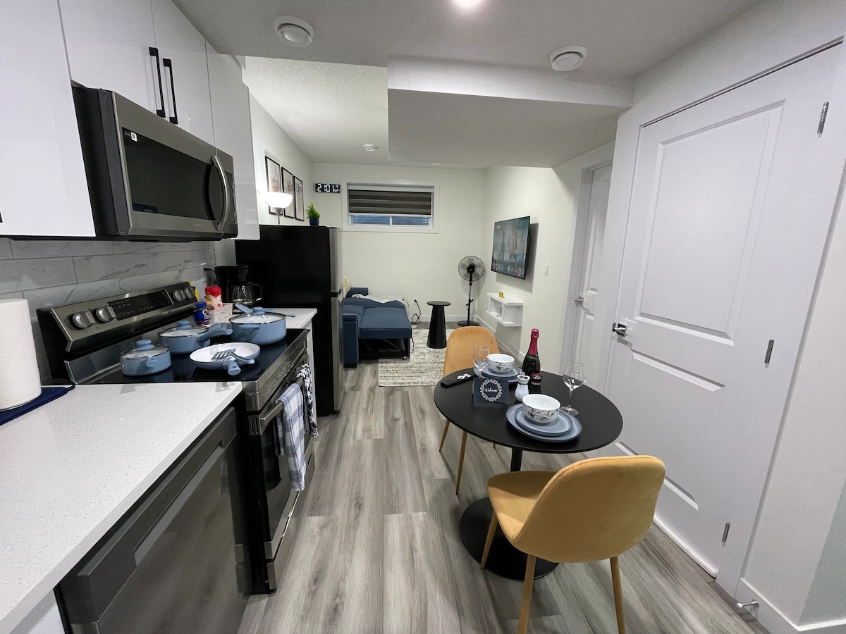 Stay in our *NEW* Ultra-Modern Suite in Edmonton's South Eastern neighborhood of Alces. This cozy one-bedroom garden suite is fully equipped for a comfortable stay. WHY BOOK WITH US: ✔ Great for Longer Stays & Month to Month Rentals ✔ Queen Bed w/ Attached Ensuite ✔ One full Bathroom ✔ Fully Stocked Kitchen ✔ Fast WiFi & Netflix ✔ Perfect for Working Remotely ✔ In Suite Laundry ✔ Professionally Cleaned