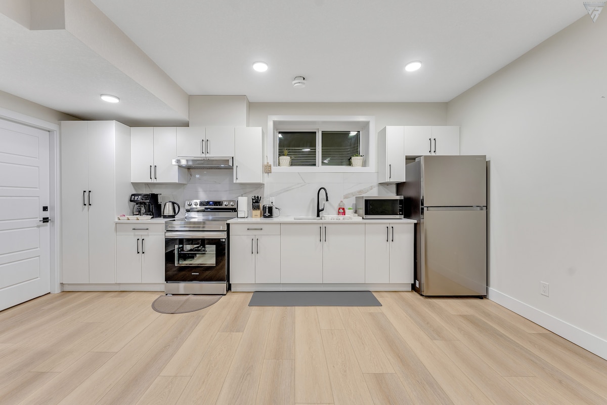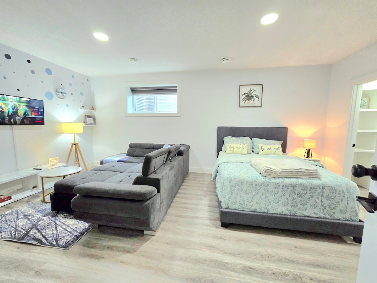 This private basement unit offers a perfect blend of modern living, spaciousness and comfort, with a main floor feel. It presents a welcoming atmosphere, perfect for entertaining guests or simply relaxing after a long day. The chef's kitchen boasts sleek stainless steel appliances, making cooking a joy. The bedroom is a cozy retreat with a king-size bed and numerous pillows for your comfort. This location provides easy & quick access to the int'l airport, local amenities, parks and more.