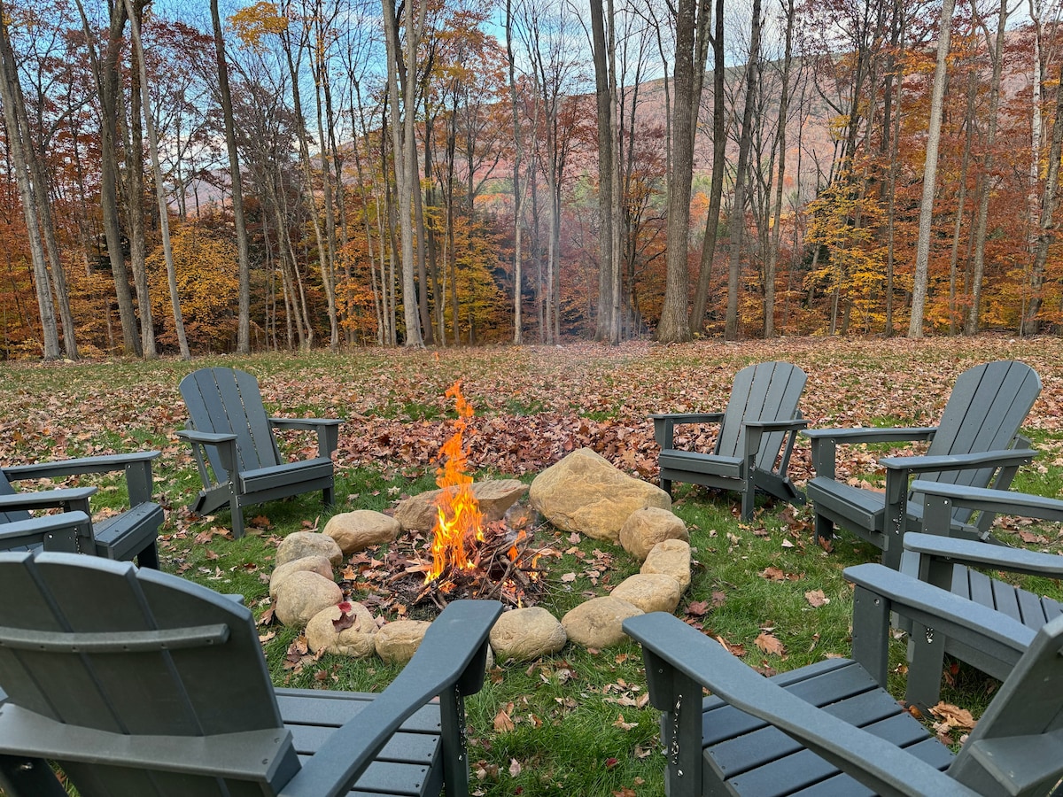 山景度假木屋,配备热水浴缸和火坑!