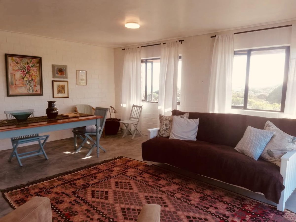 Take it easy at this unique and tranquil getaway. The Owl house is a secluded romantic tiny home in the mountain side surrounded by bluegum forest. The cottage has a private greenhouse bathroom, a stocked kitchenette, open plan living area and large king sized bed. with large flap style windows and wrap around deck. Come enjoy a night under the starts at the fire pit. This cottage is private and unique. It is off the grid with solar power and wood fire geyser. A short walk up the mountain.