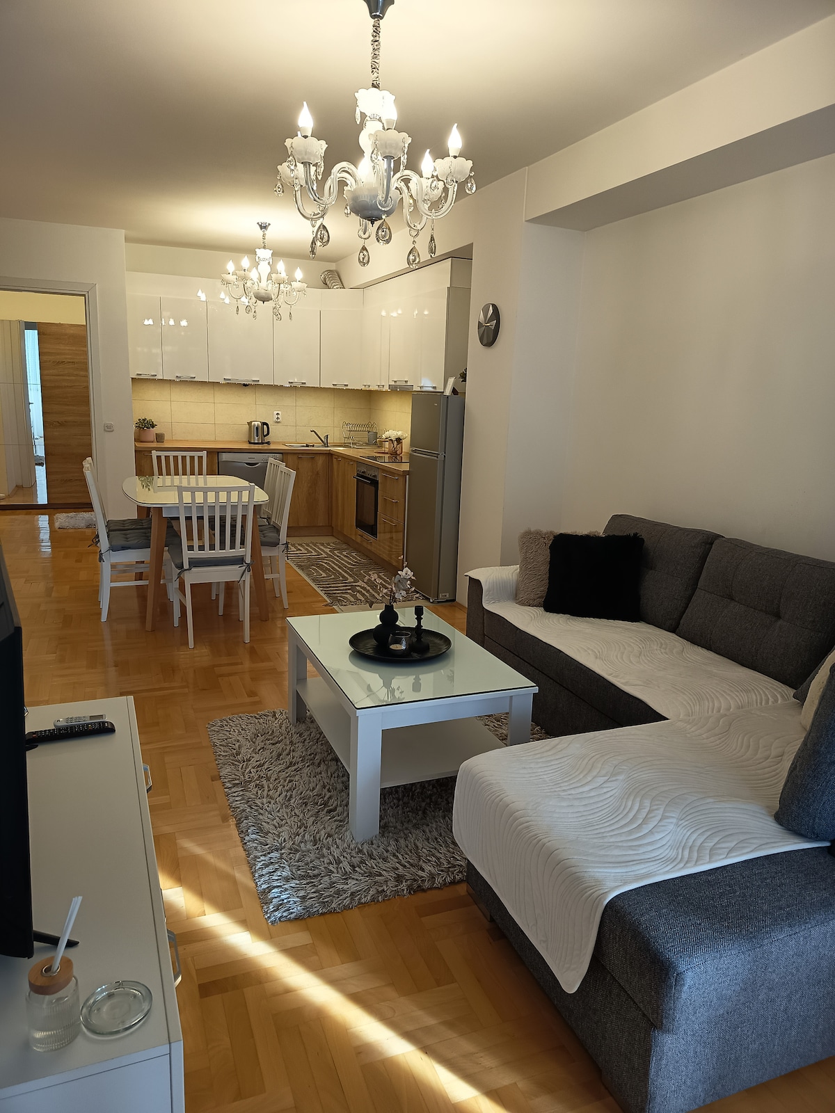 It is a new building and a brand new apartment on the ground floor, it has a private underground parking with a lift leading straight to the apartment, it has 3 supermarkets nearby, the town park is near and also the city centar. It has a fully equipped kitchen, and also a washing machine/dryer.